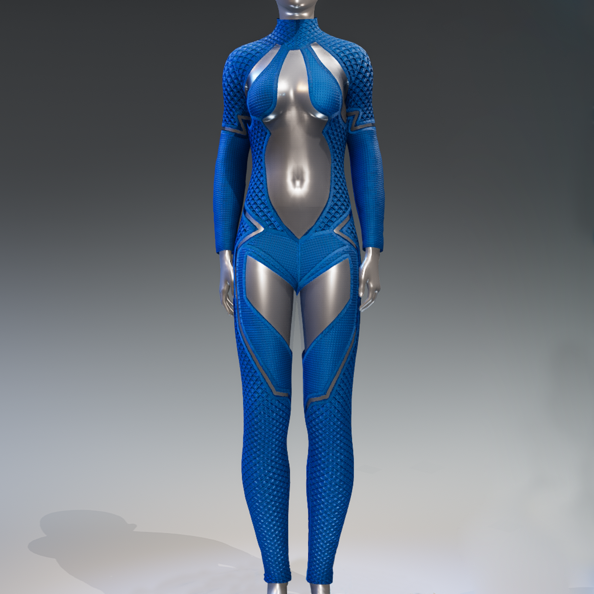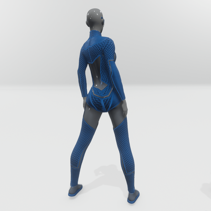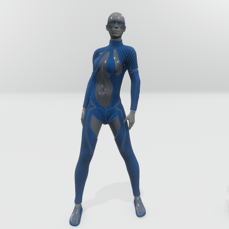 Futuristic female jumpsuit, with large, plastic like, high transparent areas. It has long sleeves and mock turtleneck. Blue color. Get the free demo item to check fit and style before purchasing here: https://store.sansar.com/listings/89a0defa-80b5-4282-a3d5-f5d807904673/baryt-jumpsuit---demo
