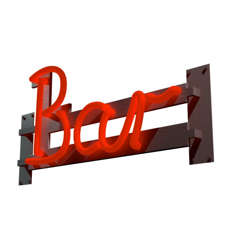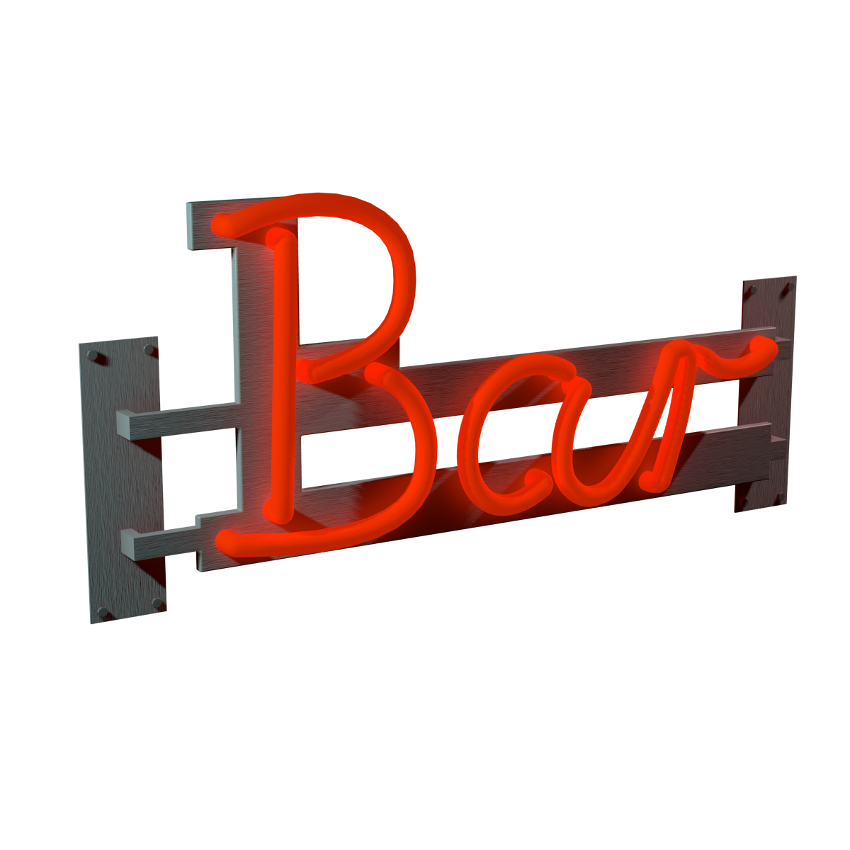 Neon lettering with the word "Bar" on a holder made of brushed metal that is mounted somewhere with several bolts. The lettering is self-luminous. This is intended to be mounted outside of a bar.
