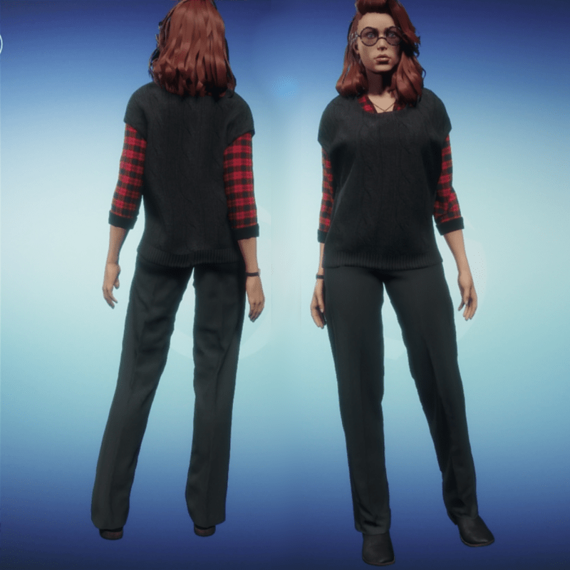 Red plaid shirt with contrasting rolled-up cuffed sleeves and stand-up collar paired with a soft cable knit sweater vest. Please use simulate when wearing this set, and wear hair only after you have finished the simulate process. If you forget and the hair eats the sweater just take the hair off and reapply the sweater and begin simulate again. Styling card: worn with Journey Women's Slacks and Cora's boots.