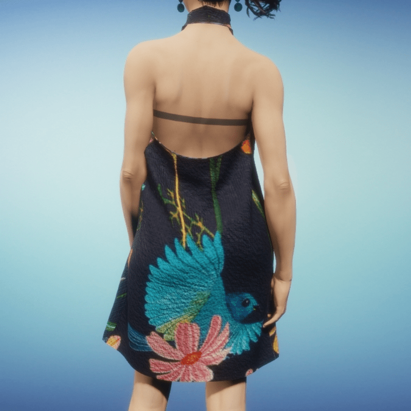 Crepe de Chine fabric gently wraps around the neck creating a deep V peek-a-boo neckline. The dress has piping around the neckline and arm openings. It's best to wear this dress and simulate cloth before wearing hair as the hair can affect the cloth around the neck as the cloth simulates. Remember you can always rewear the garment if you achieve an undesired effect while simulating the cloth. The baked on bra strap does show in the back. I'm hoping this strap will be removed by Linden Lab in a future update.