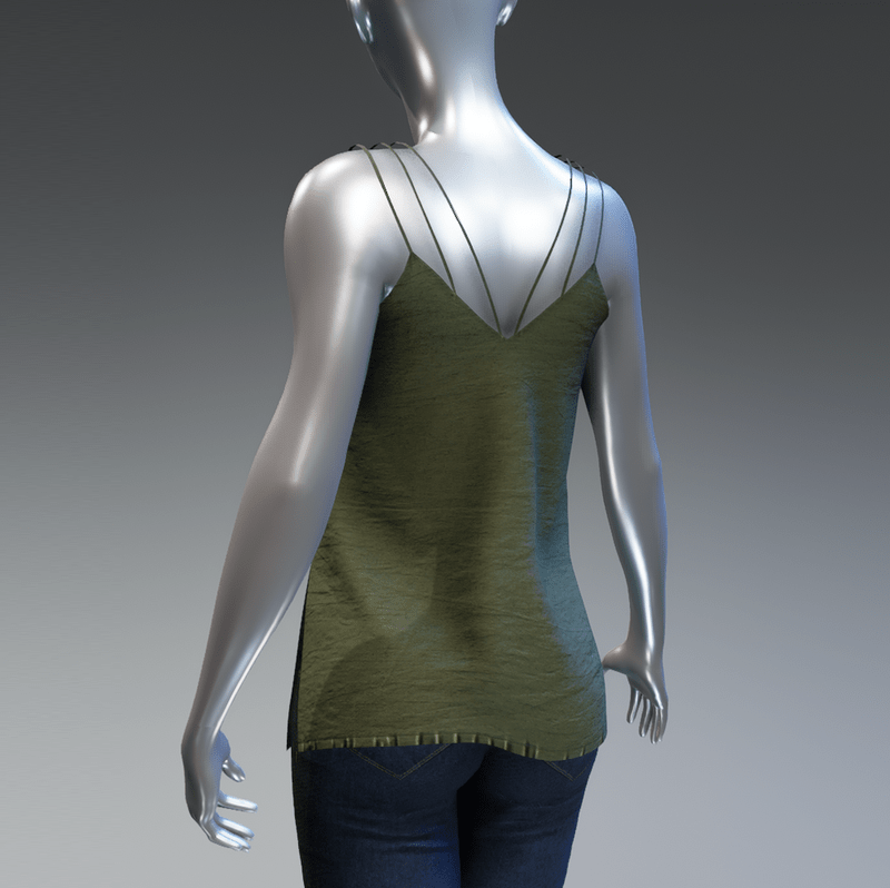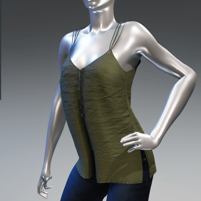 A summer cami top with three spaghetti straps and buttons in front. Is made with wrinkled fabric in solid green colour. Get the free demo to check the style and fit here: https://store.sansar.com/listings/68dccc25-b0c1-4e21-bdfe-fd7f4e9e7de6/spaghetti-straps-top---demo