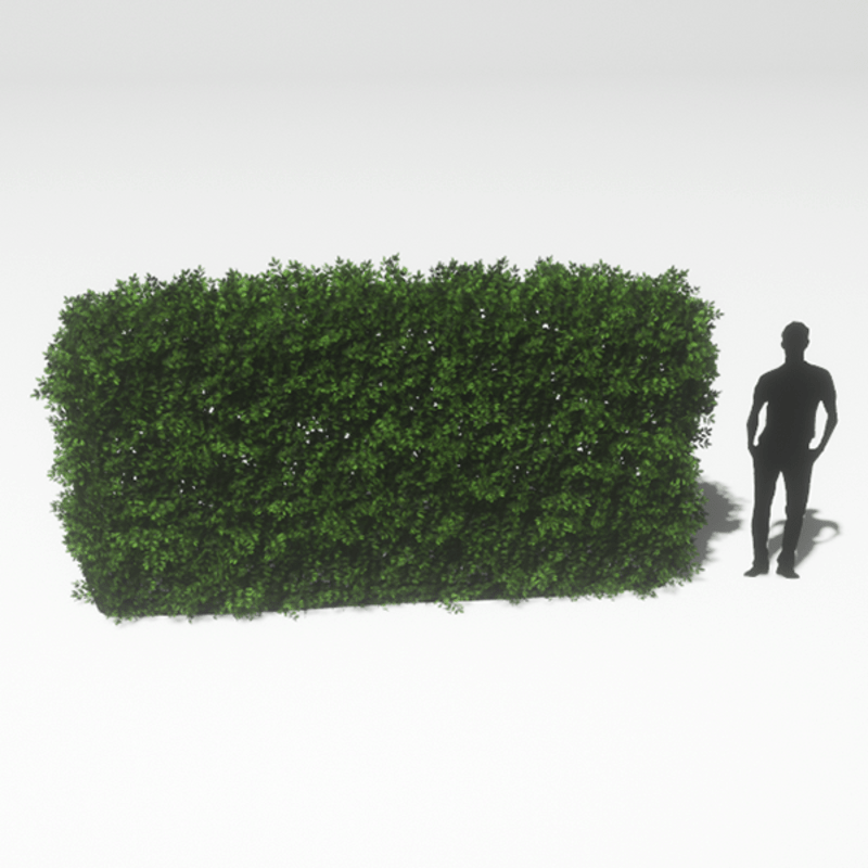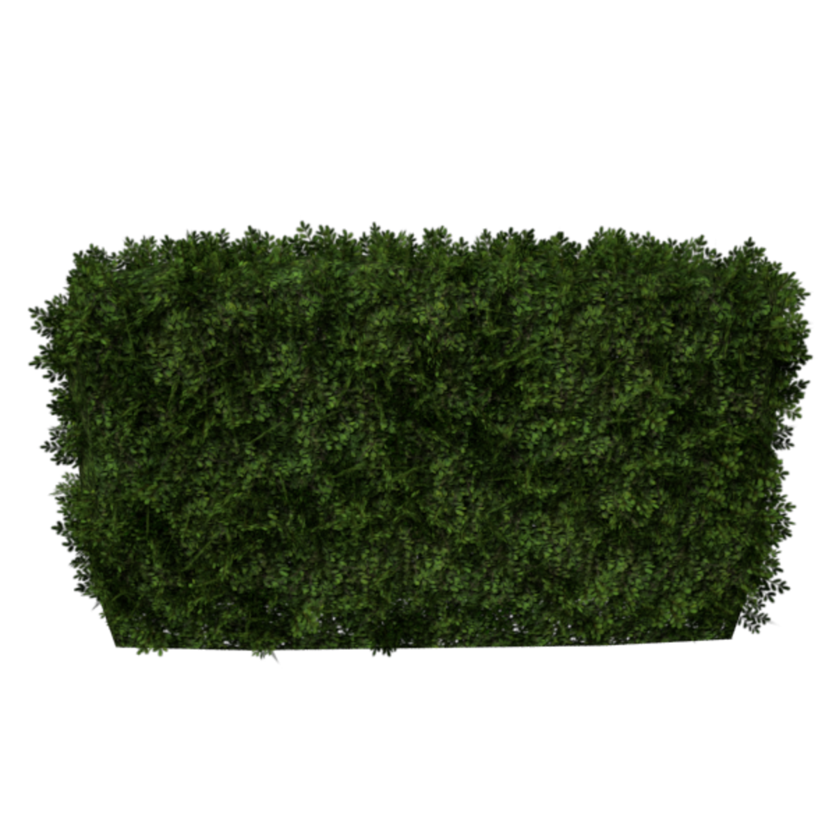 A straight English Boxwood hedge section with deep green leaves. Opacity mapped textures are used for base and leaves. Approximately 4m wide, 1m deep and 3m tall. 3156 triangles.