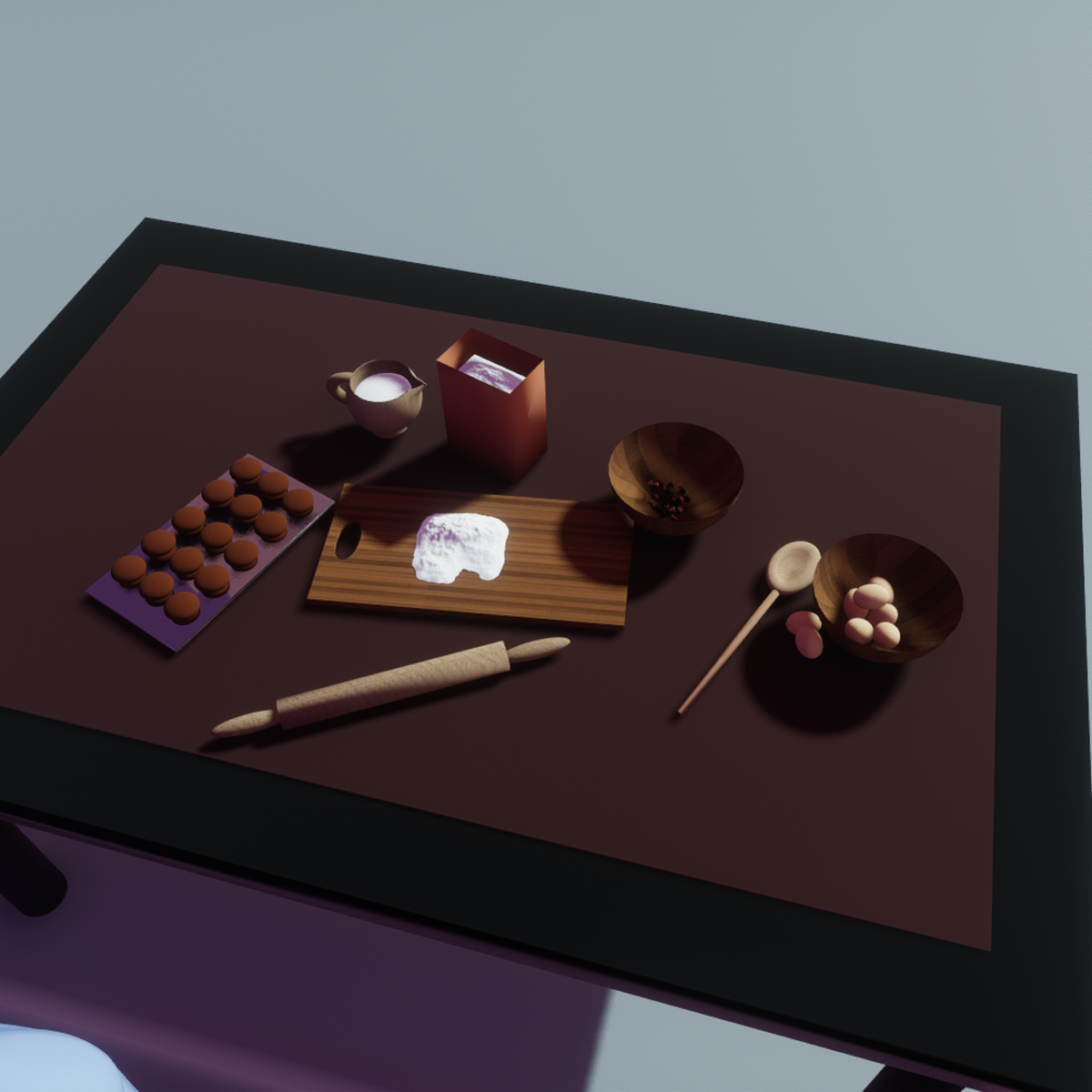 A cute little collection of baking gear! Comes with cupcakes, cupcake pan, rolling pin, spoon, 2 bowls, eggs, chocolate chips, jug, milk, flour, flour bag. Part 2 is coming :D Stay tuned! Table not included.