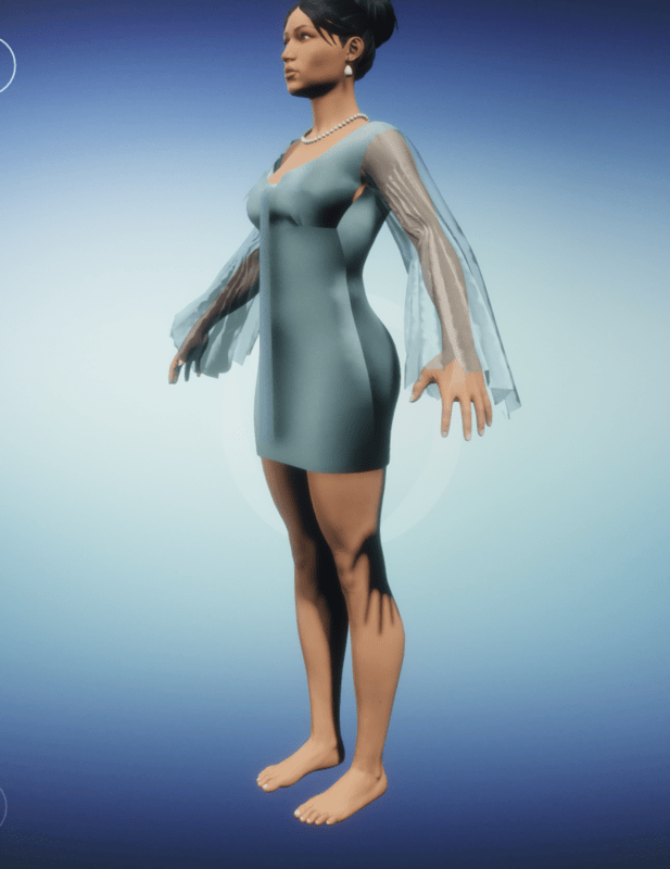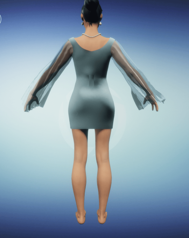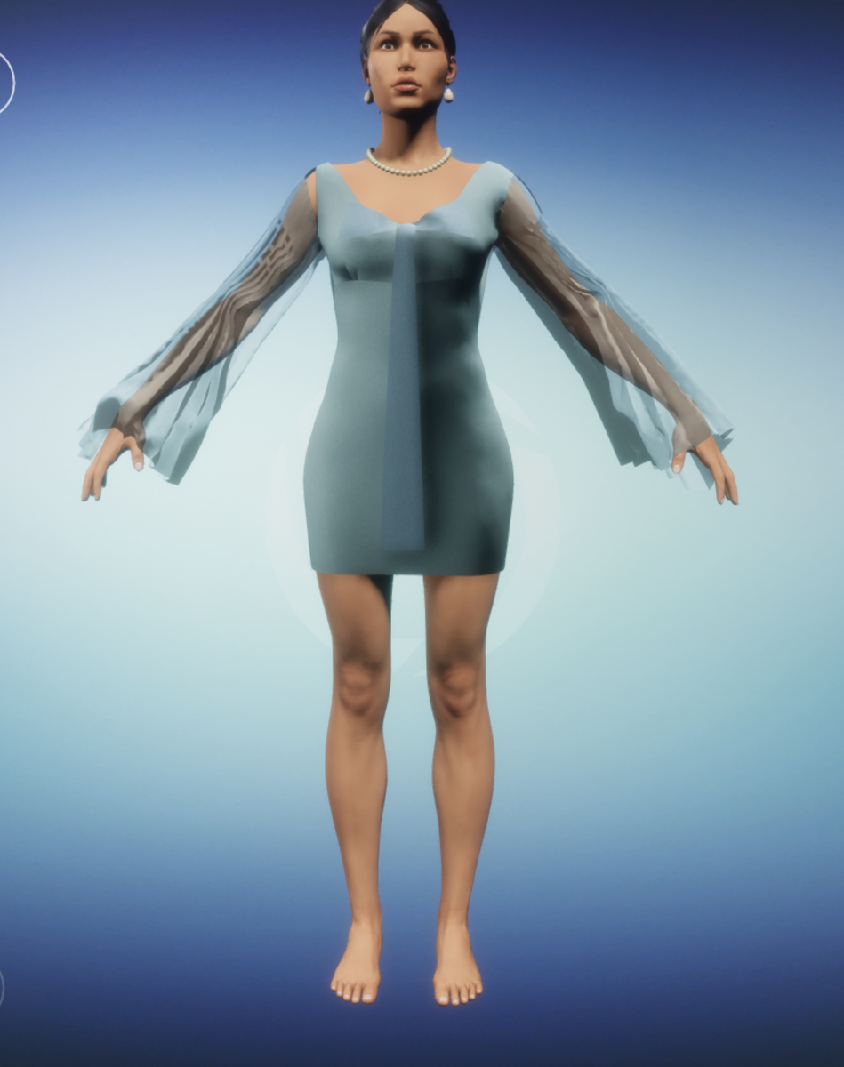 A 1968 "Mod" minidress made of lustrous aqua and pale blue polyester chiffon. Hem to mid-thigh, darted sweetheart decolletage. Billowing, pleated and sheer trumpet sleeves. Finished with a grosgrain ribbon bow in front. Inspired by a dress "Megan Draper" wears on TV's MAD MEN.