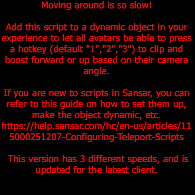 Moving around is so slow! Add this script to a dynamic object in your experience to let all avatars be able to press a hotkey (default "1","2","3") to clip and boost forward or up based on their camera angle. If you are new to scripts in Sansar, you can refer to this guide on how to set them up, make the object dynamic, etc. https://help.sansar.com/hc/en-us/articles/115000251207-Configuring-Teleport-Scripts - This version has 3 different speeds, and is updated for the latest client.