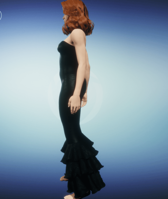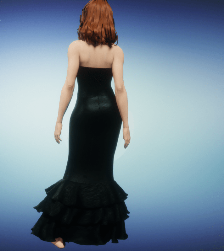 Classic mermaid dress as introduced in the 1940's. Skin-hugging strapless satin sheath dress with frilly layers at the lower edge. In black.