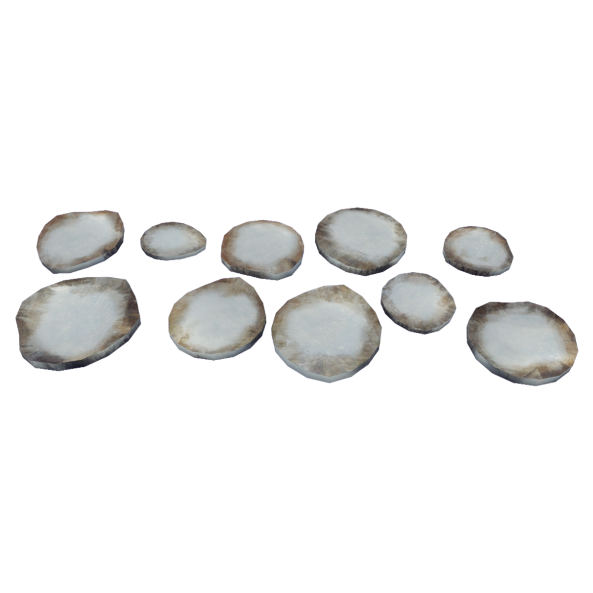 A walkway made out of wood slices. It's a good addition to your garden, or any area you want to add a natural and whimsy look. Each step is covered by a layer of snow.