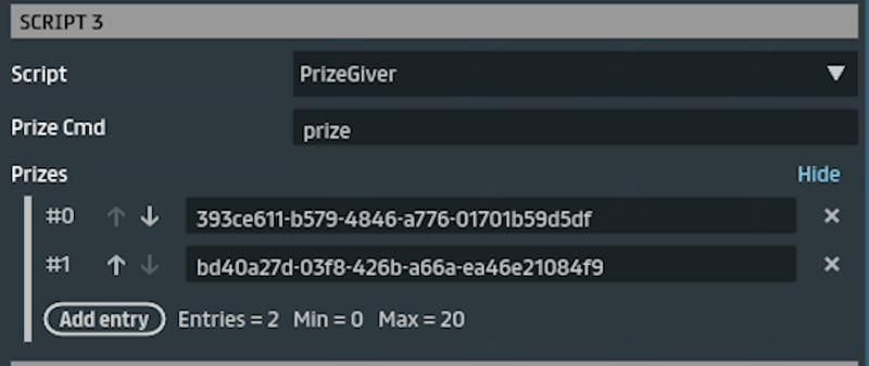 Give Prizes out from Store for Games and Stuff. Documentation: https://github.com/mojoD/Sansar-Simple-And-Reflex-Script-Integration/wiki/Prize-Giver Video: https://www.youtube.com/watch?v=AJLxwrNOeyU