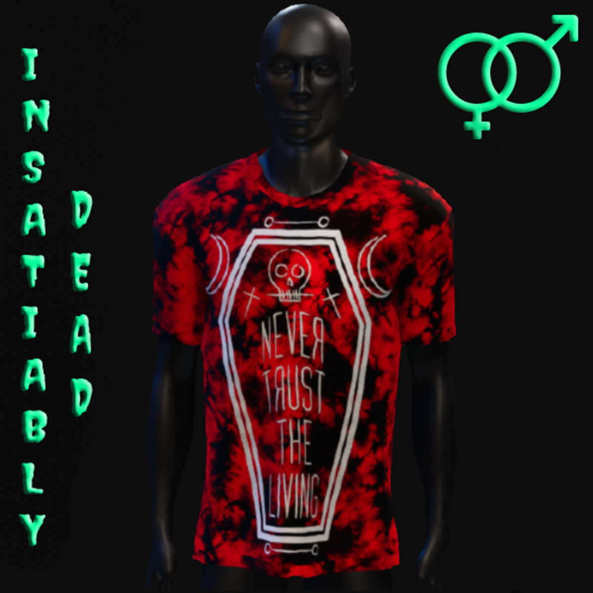FOR ALL THE GHOULS AND GALS. UNISEX "NEVER TRUST THE LIVING" T-SHIRT DARK TIE DYE [BLACK/RED]. CREATED IN MARVELOUS DESIGNER WITH AVATAR 2.0. ADJUSTMENT MAY BE REQUIRED! FITTING INSTRUCTIONS CAN BE FOUND BY GOING TO THE LINK BELOW. https://help.sansar.com/hc/en-us/articles/115005693363-Fitting-Marvelous-Designer-clothing-to-your-avatar PLEASE RATE AFTER BUYING! IF ANY ISSUES OCCUR PLEASE CONTACT TEAGAN BROKKEN FOR ASSISTANCE. THANK YOU! <3 <3 GET INSATIABLY DEAD <3
