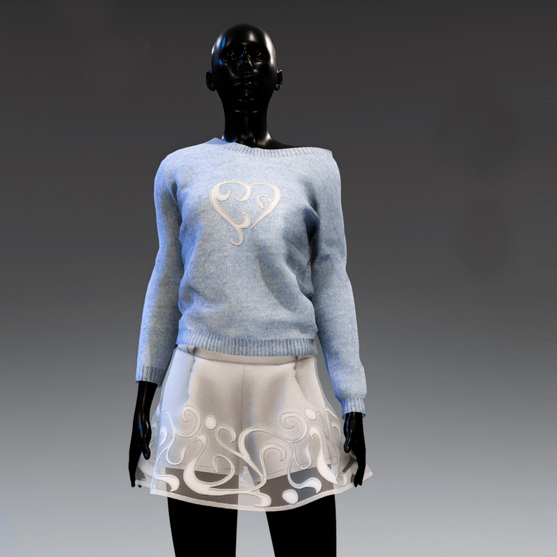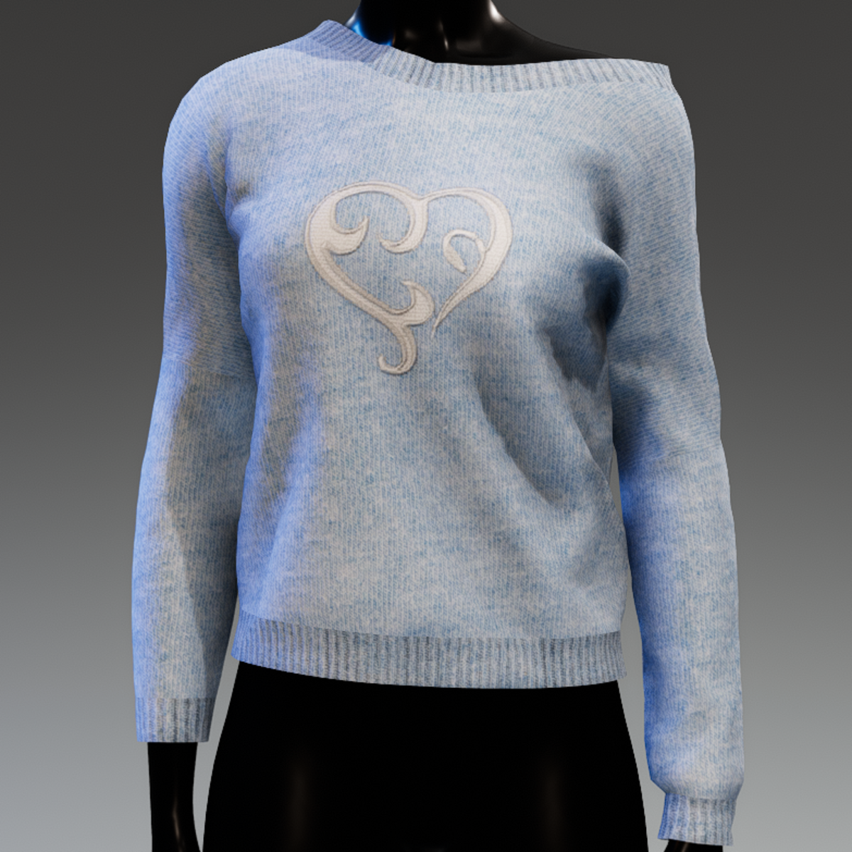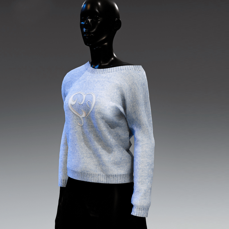 Cute, comfortable and versatile, long sleeve knit top that can be worn to reveal the shoulder. In light blue colour with a white applique heart on the front. It matches the "Sweetheart skirt"