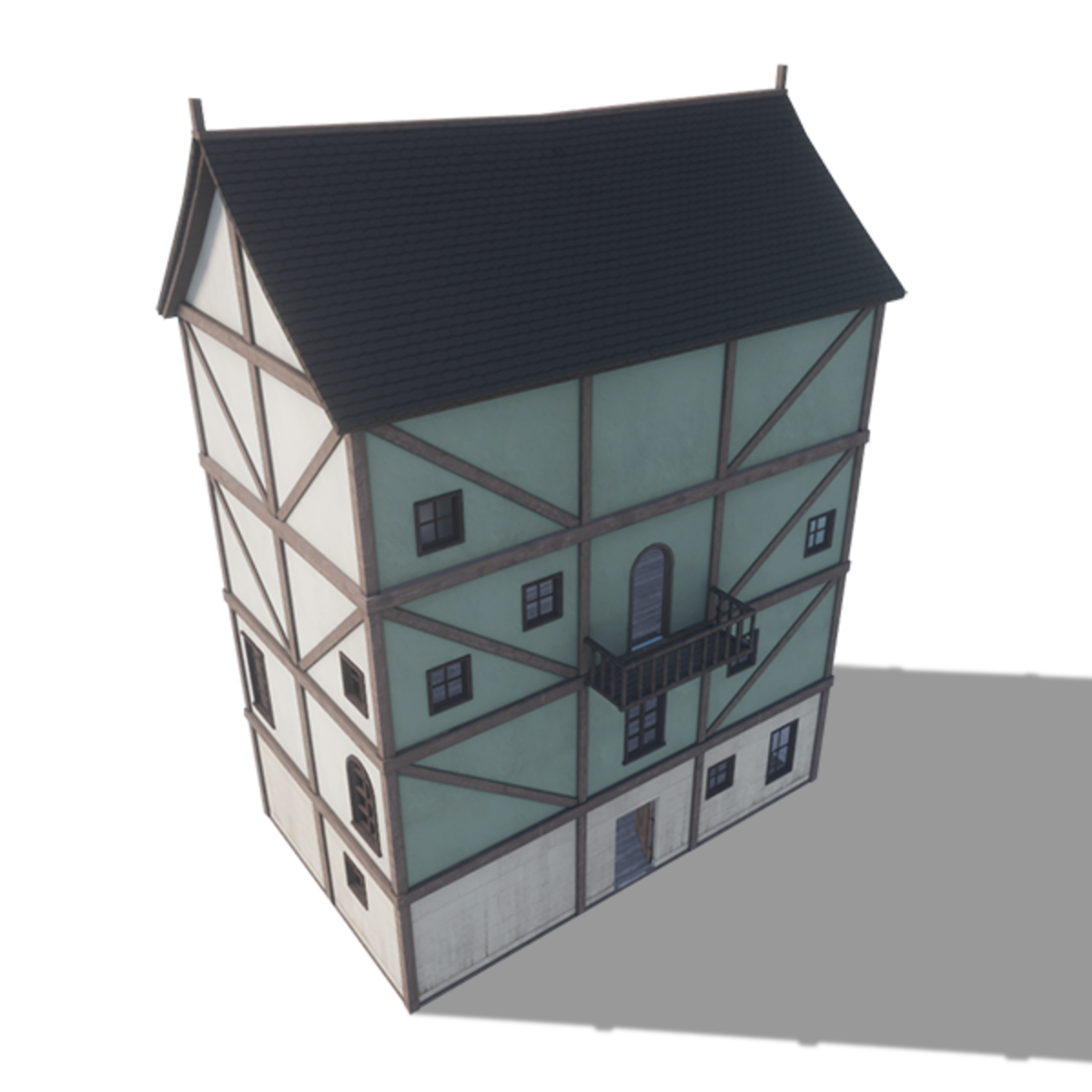 Timber frame archetypal style popular in Europe from 12th to the 19th century. The building features 3 floors and a balcony.