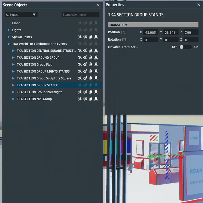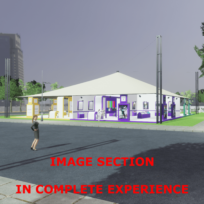 This section is composed of 8 tents distributed around the central axis of the experience. Each tent contains 4 stands of different colors; red, green, yellow and purple. Each stand has wall and floor panels, a reception desk, large table with multimedia screen and chairs: a room with sliding glass doors with a table and armchairs for meetings. All booths are numbered from 1 to 32. Booth 1 has posters with images alluding to SANSAR, in them there is interaction with basic scripts that can be used by editing object structure, copying and pasting them on the other panels that require it. Everything is properly grouped, with all permissions enabled. You can use it to complete this experience or for other needs. This group of objects is one of the 8 sections that make up full experience in sales for exhibitions and events. You can visit it in the world where you will find a sales panel, with the 7 sections that complete the experience, (panel not included in the experience, but equal to welcome panel if included). https://atlas.sansar.com/experiences/fernandop/full-experience-in-sales-for-exhibitions-and-events The positioning coordinates shown in one of the images of this item are : Position X= -72.903 Y= 28.941 Z= 7.99 Once acquired, placed in the experience you are going to create, select the item in your inventory and drag it to the world. In the Scene Objects panel, select ( TKA SECTION GROUP STANDS ). In the Properties panel, change the position coordinates to those indicated above. Please rate this item