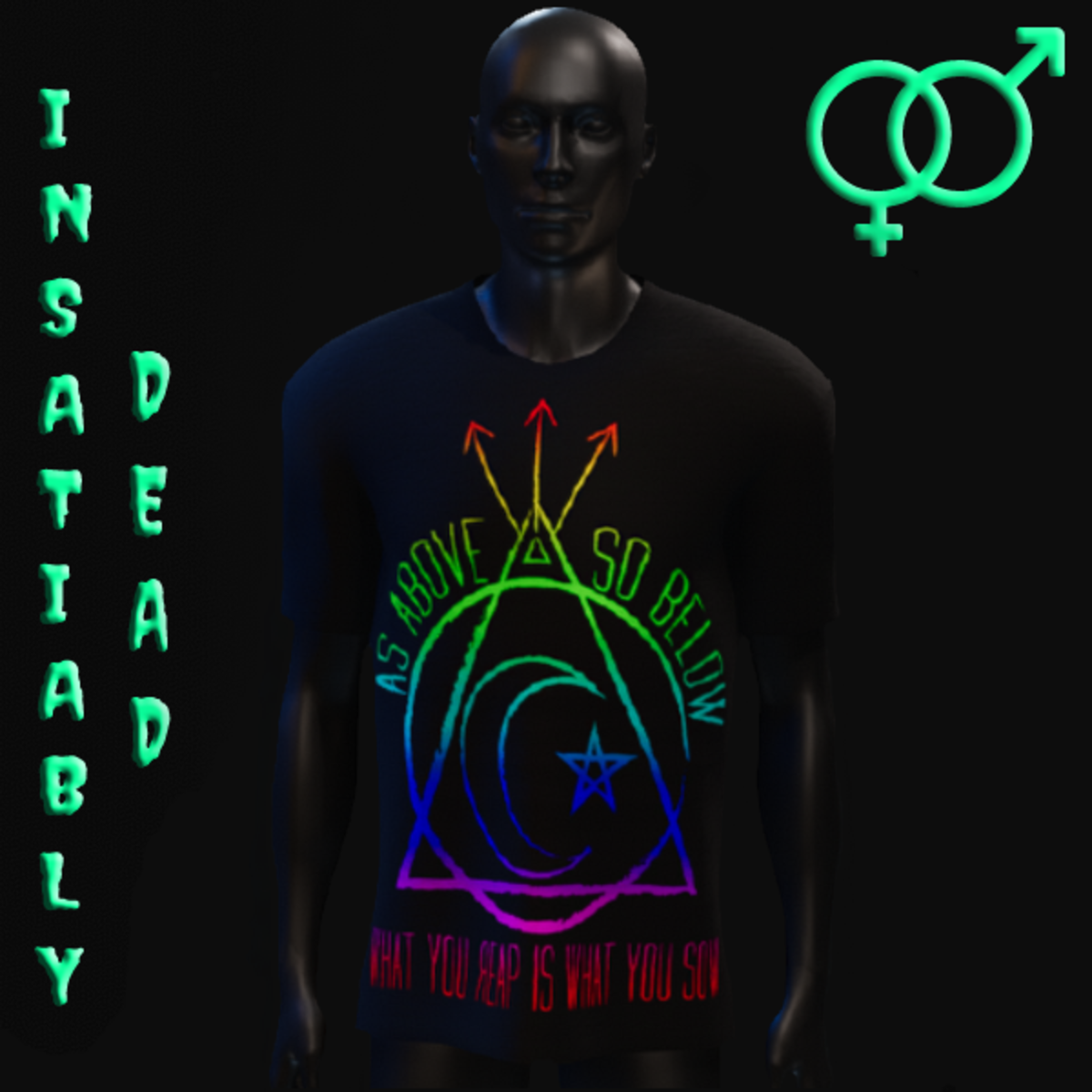 FOR ALL THE GHOULS AND GALS. UNISEX "AS ABOVE SO BELOW" T-SHIRT [BLACK/RAINBOW]. CREATED IN MARVELOUS DESIGNER WITH AVATAR 2.0. ADJUSTMENT MAY BE REQUIRED! FITTING INSTRUCTIONS CAN BE FOUND BY GOING TO THE LINK BELOW. https://help.sansar.com/hc/en-us/articles/115005693363-Fitting-Marvelous-Designer-clothing-to-your-avatar PLEASE RATE AFTER BUYING! IF ANY ISSUES OCCUR PLEASE CONTACT TEAGAN BROKKEN FOR ASSISTANCE. THANK YOU! <3 <3 GET INSATIABLY DEAD <3