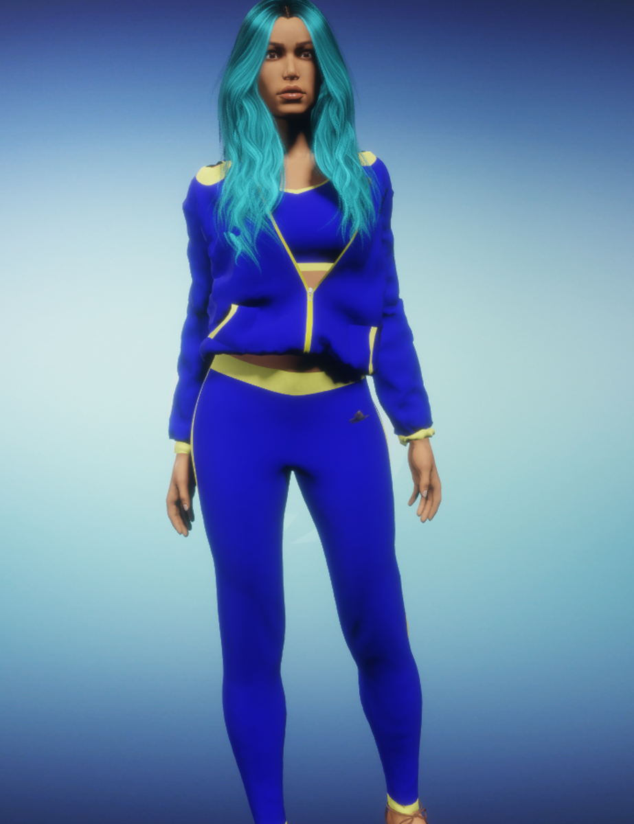 Jogging suit in blue with yellow trim.