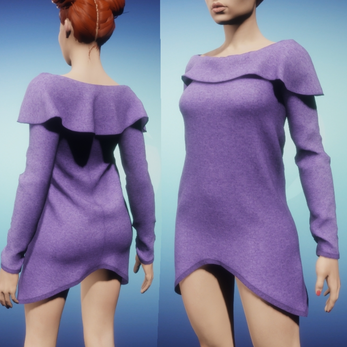 Please be sure to hit the simulate button in the lookbook when wearing any clothing made in Marvelous Designer. This much improves the fit as well as gives you the chance to push the fabric around to your liking. It is advised to not wear hair until you have completed the simulate process.