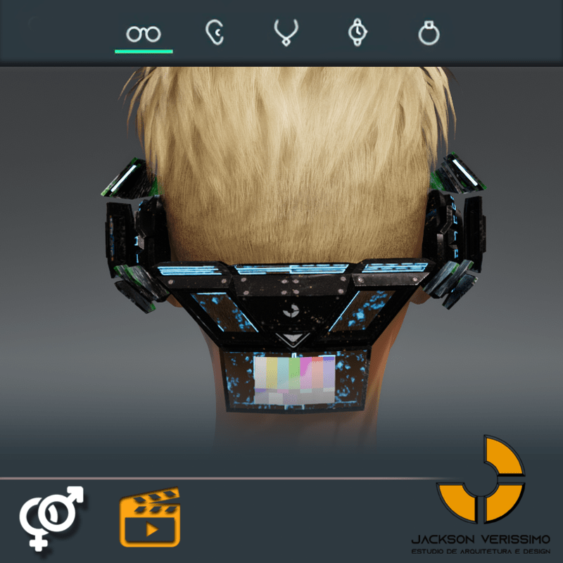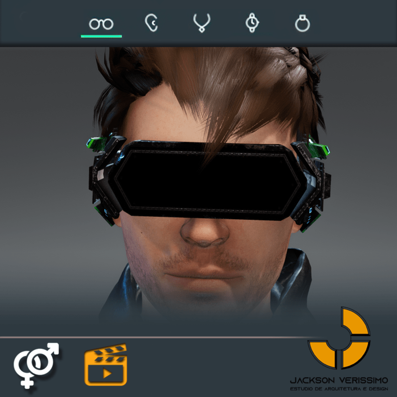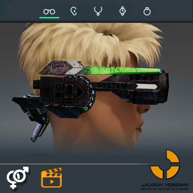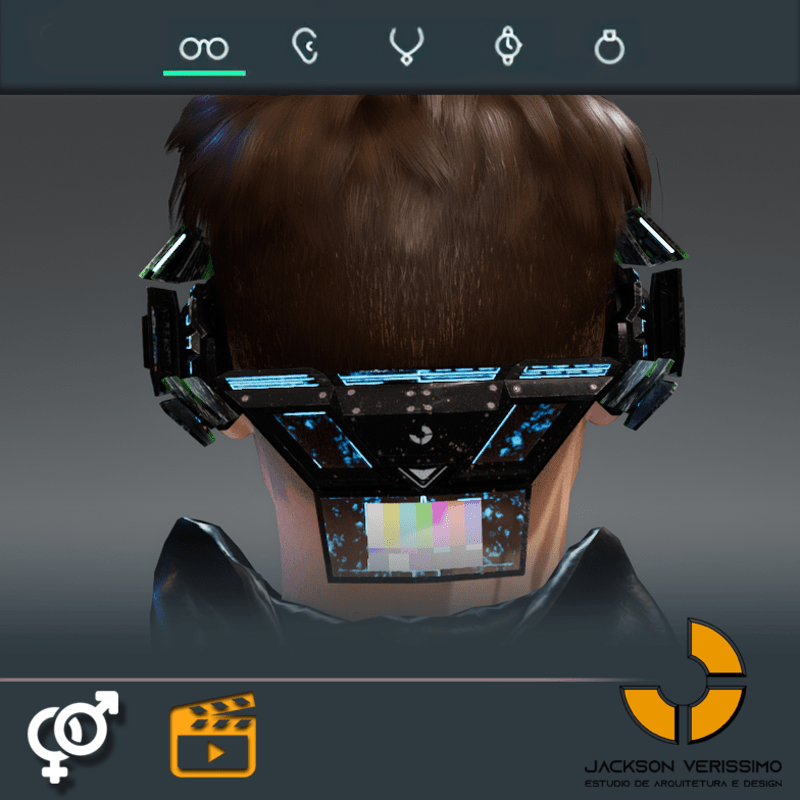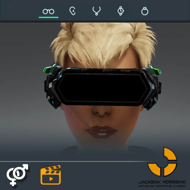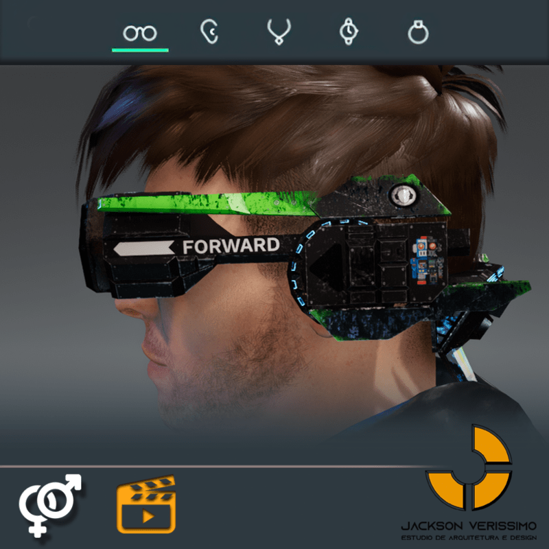 Visionary Design for a VR Headset exclusive for the Sansar Metaverse. Special and High Quality Texture. Vr glasses with headphones, Emissive lights and Media Screen. Unisex. Matches with all humanoid avatars. No need for adjustments for the default 2.0 Avatar of Sansar.