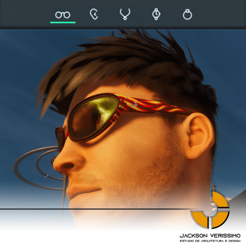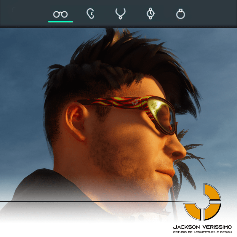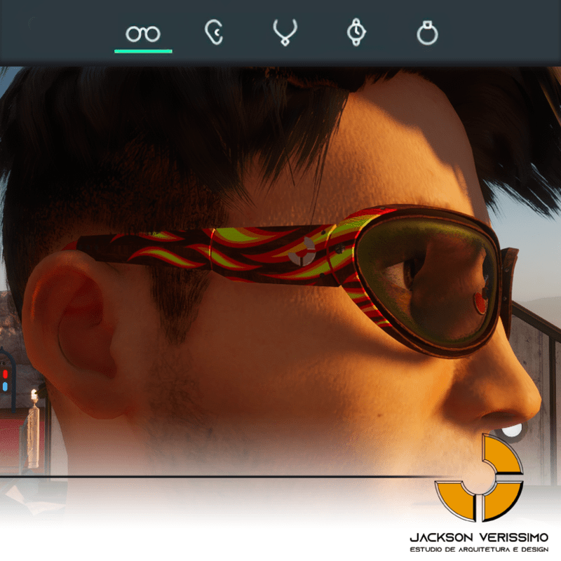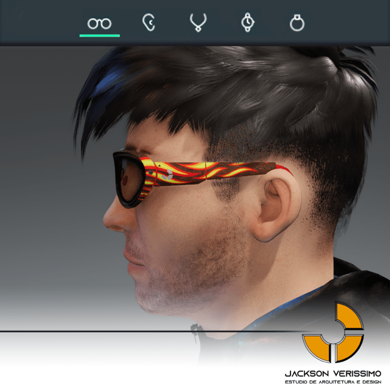 pecial design for sunglasses of Wood with flames stamp. Original by JackVerissimo. Transparent and Metalic Lens. Frame of Wood with color detail. Special PBR textures. Unisex. Match with all humaniods avatars. Sometimes you will need a easy adjustments to fit.