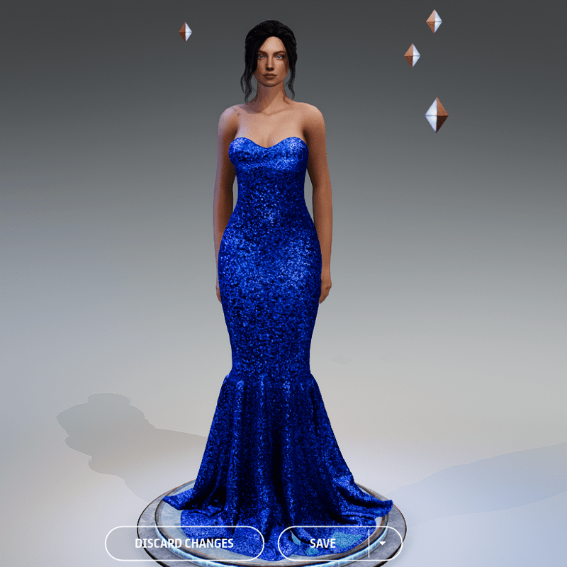 Mermaid Dress royal, fitting all avatars. For Default Avatar you need just a quick clothing adjust. For Alina and more curvy avatars transform item a bit bigger in scale, then simulate clothing and stretch the dress from stomach upward.