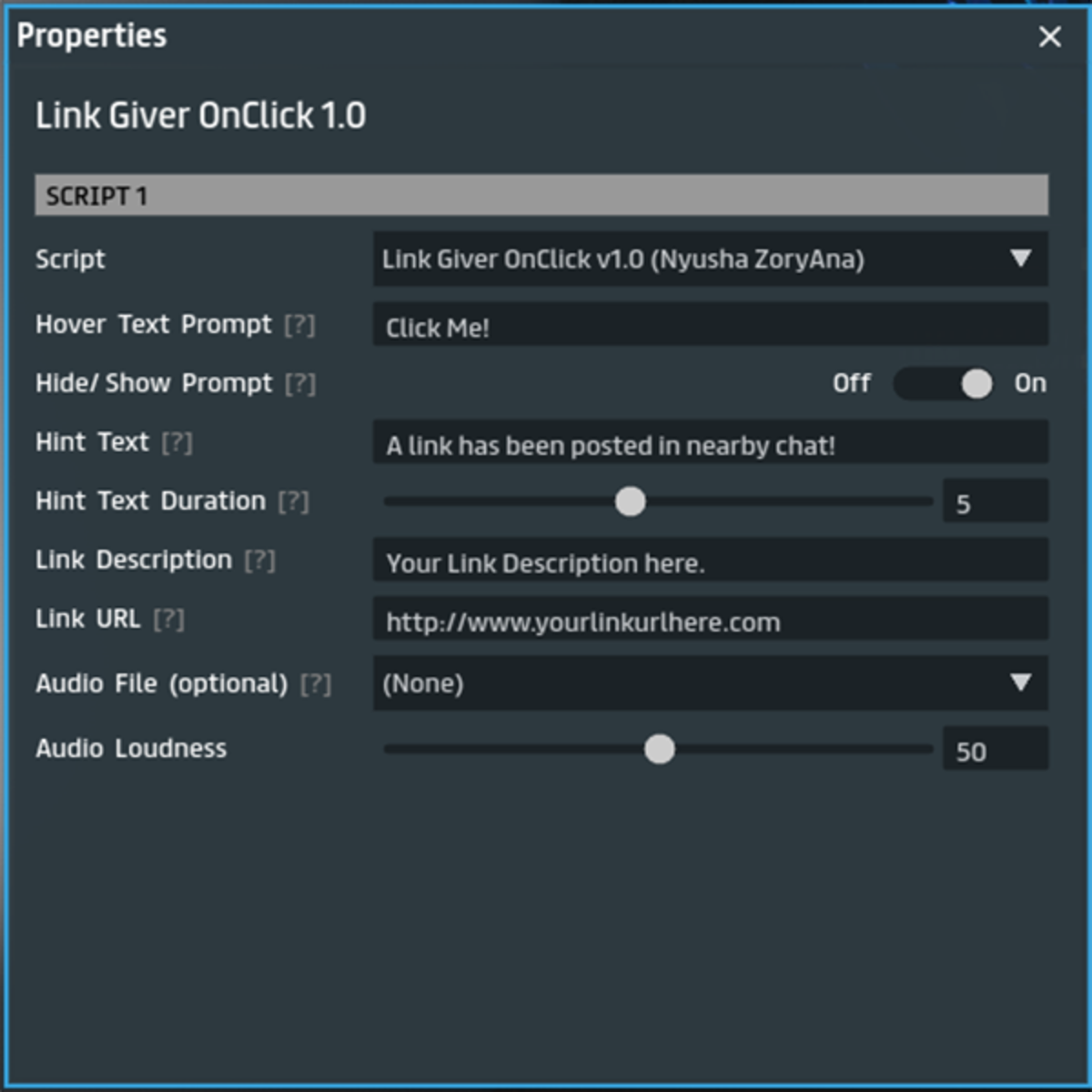 This is the Hint Text Edition (HTE) of the Link Giver OnClick script. Transform your objects/Models into clickable link givers for websites, Social Media pages, YouTube videos/channels, online stores and more. This easy to use script sets up an "interactive prompt" which people can click on to have a link posted privately to them in nearby chat. This script posts a notification message on the Sansar client screen in the text hint UI that a link was posted in nearby chat. Supports multiple people using it simultaneously without Spamming one another or others in your experience. You can configure the * Interactive Prompt Hover text message * Hint Text message to be displayed on the Sansar client window. * Adjust the Hint Text duration displayed (1 to 10 seconds). * Automatically Hide/Show (disable/enable) the Interactive prompt for the duration the Hint text message. * Link Description and URL posted in Nearby Chat. * Optional Audio/sound file to play (including loudness) to the user when they click on the interactive Prompt.