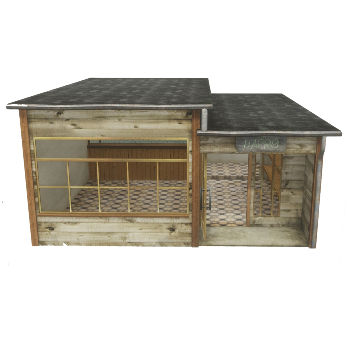 This is the build of Cafe Happy. It is a small coffee shop with wooden exterior and vintage rainwater pipes. It has two doors; one is for entrance, and the other is a back door. It has a big window on the front where the kitchen counter can be easily seen. Upon entering, the wall on the right is made as a library shelf where you can store different items to decorate the mood of the cafe. It can be see here: https://atlas.sansar.com/experiences/stupidmonkey/abby-s-monkey-s-things