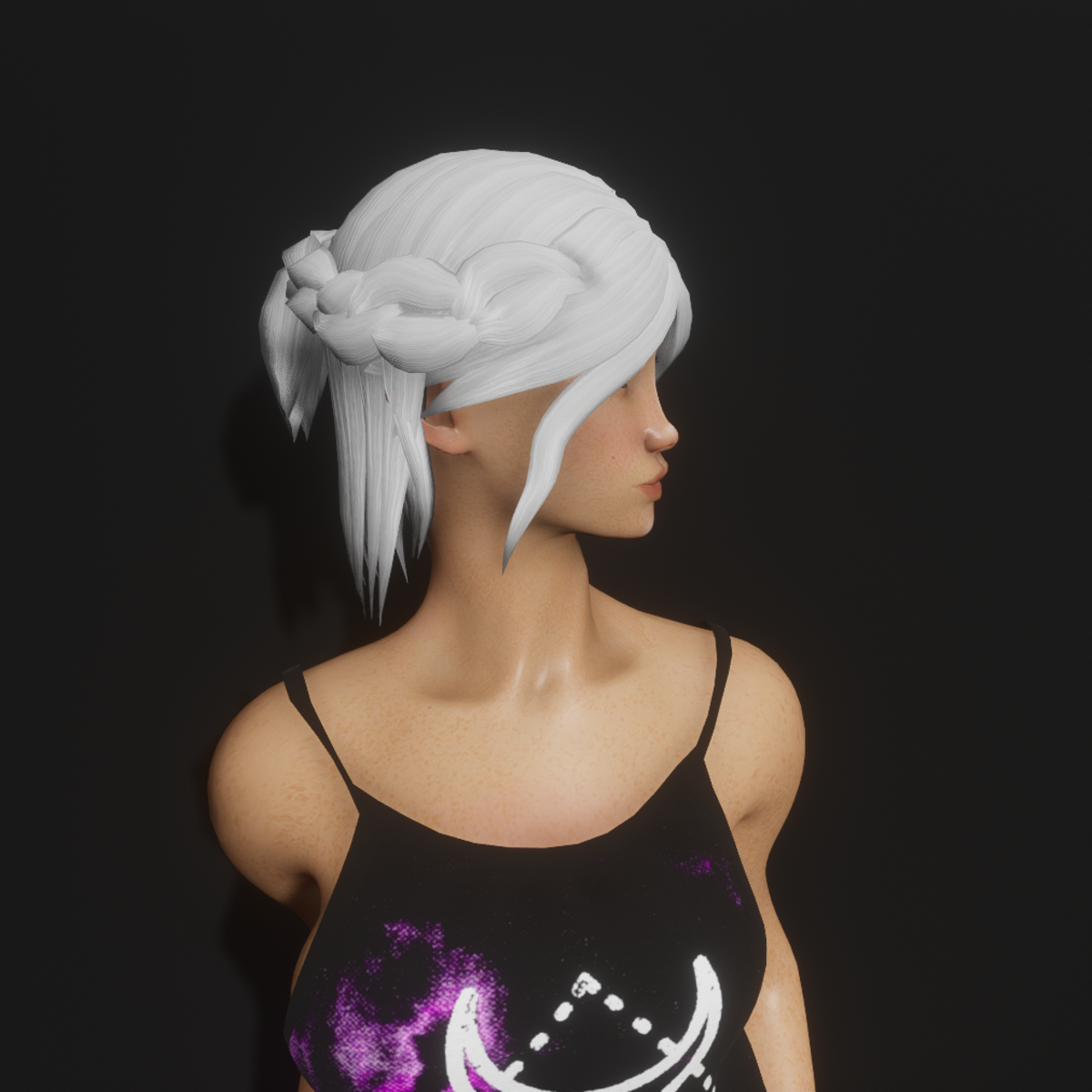 A cute hair that's shoulder length, has bangs and a braid that is wrapped around back of head and finally adjacent into a short ponytail. You can change colour and it is rigged.