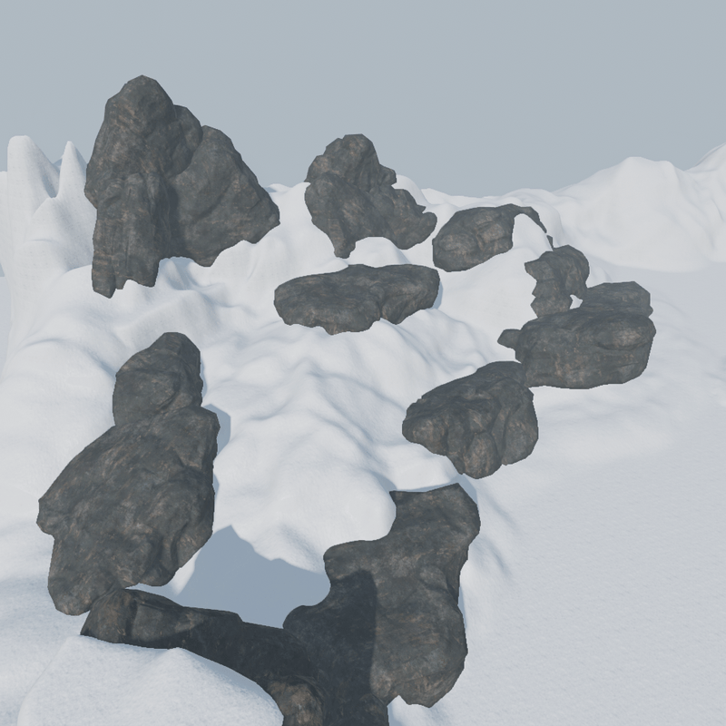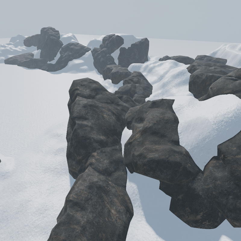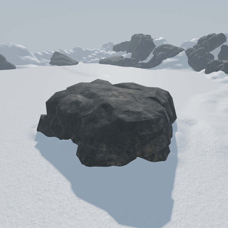 Dark and dirty rock boulder. Designed for reuse - duplicate it many times and rotate each instance to make it "different". To save graphics memory and get high resolution it utilizes blended tileable textures. Current material have been designed for use in a winter setting. More materials will be added when it will be possible. Other types coming soon... Features: - One day will be possible to change texture resolution - Free updates Tech specs: - Default dimensions: 7.7 x 6.6 x 3.3 meters (recommended to scale 2-3 times to get the illustrated results) - Textures: 512x512 blend map + 512x512 baked stone normal map (set to detail map slot) + 3 reusable and seamless 1024x1024 materials (albedo/normal/roughness) + black metallic 32x32 texture - Collision: Yes - Triangles: 498 (and 112 for collision) - LODs: Will be added when possible keywords: stone, cave, cliff, low poly, environment