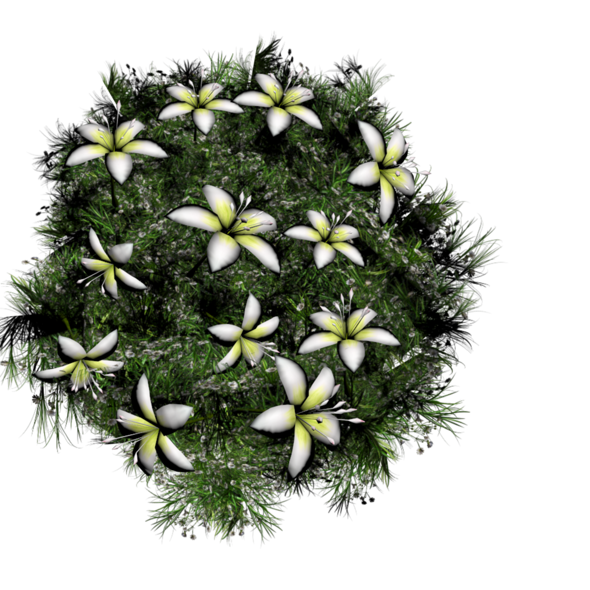 I am trying to make 2d grass (just from planes) mixed with 3D detailed lilies. I am happy with the grass only in the top view but I've been trying for 2 days now. So, I will make this cheap. It will look good if you bring several together and mix other grass around it. In my mind, the edges don't look natural. But the top view looks pretty good which is very hard to make.