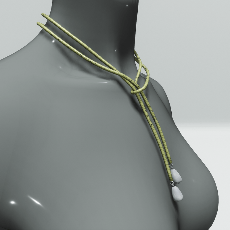 A slip on necklace in yellow colour with two irregular shape pearls at the end of each strand and silver details.