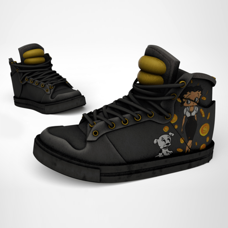 A black and yellow hightop sneaker for females. Shoes has a graphic of classic cartoon BettyBoop.