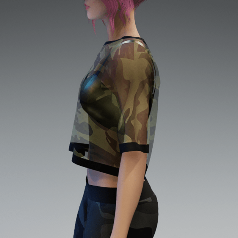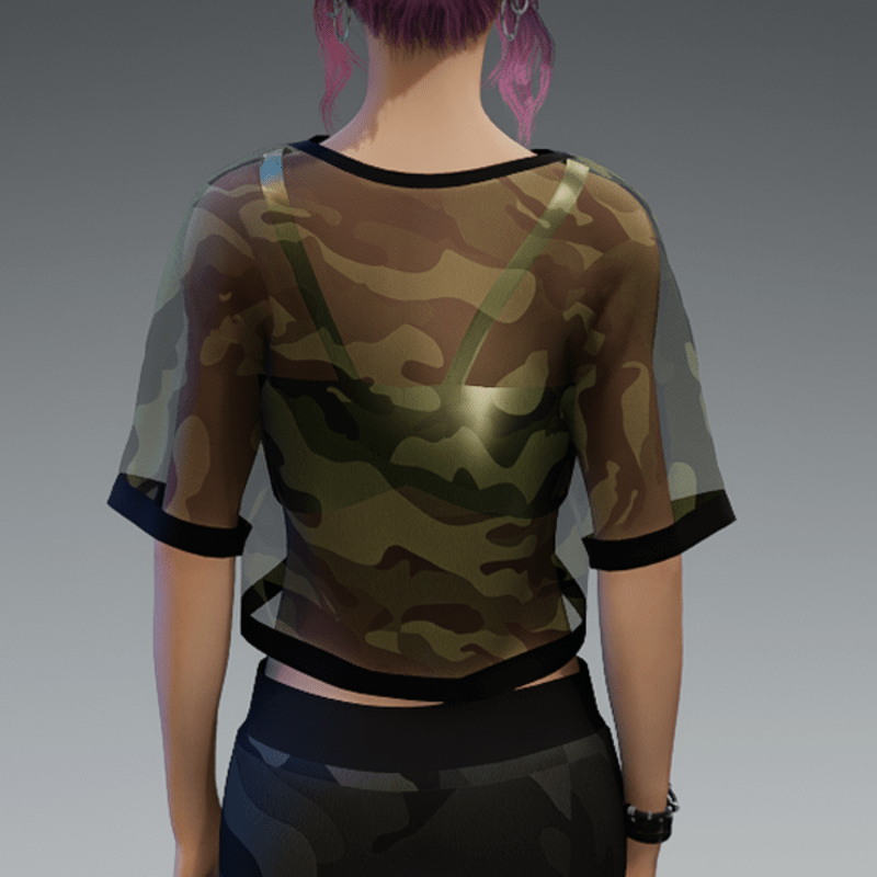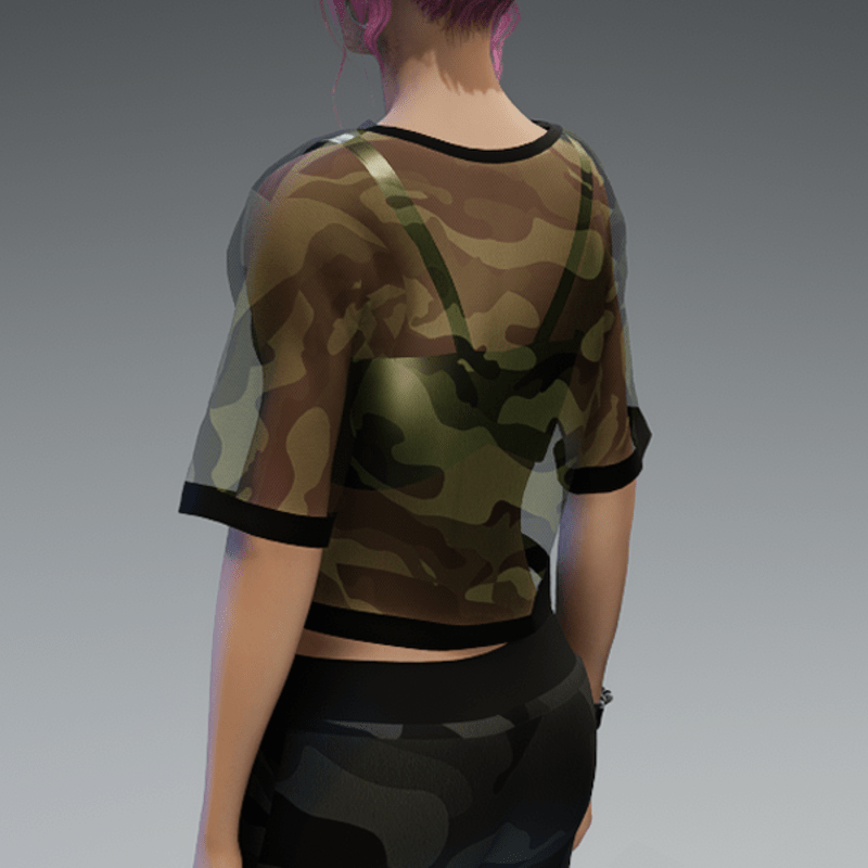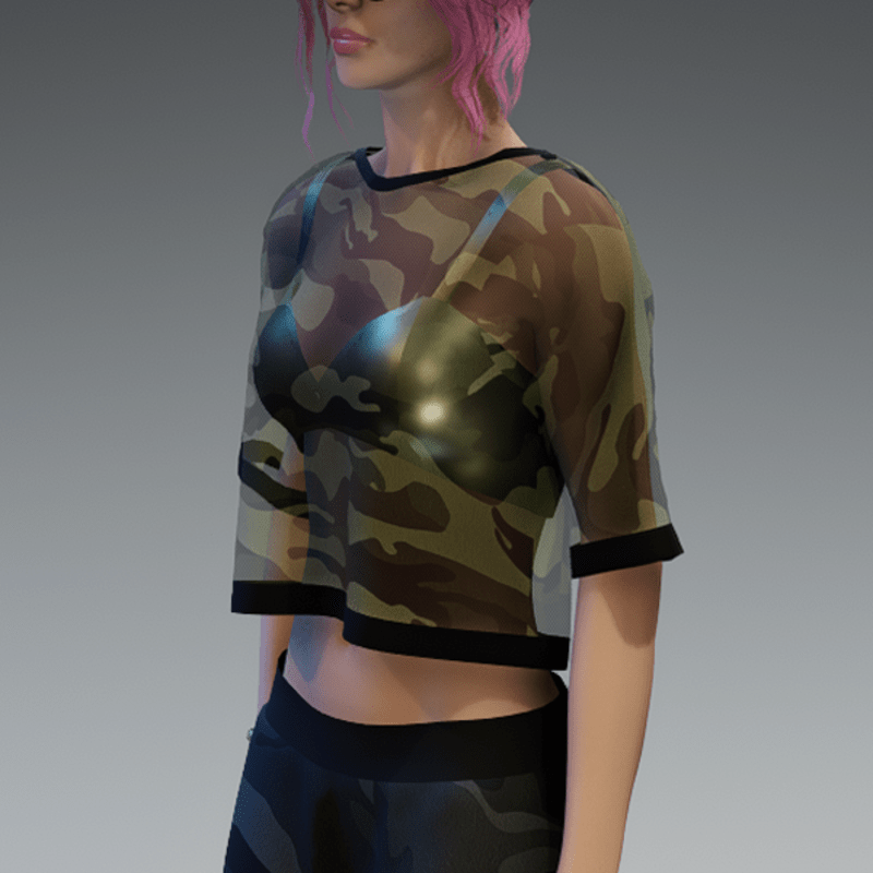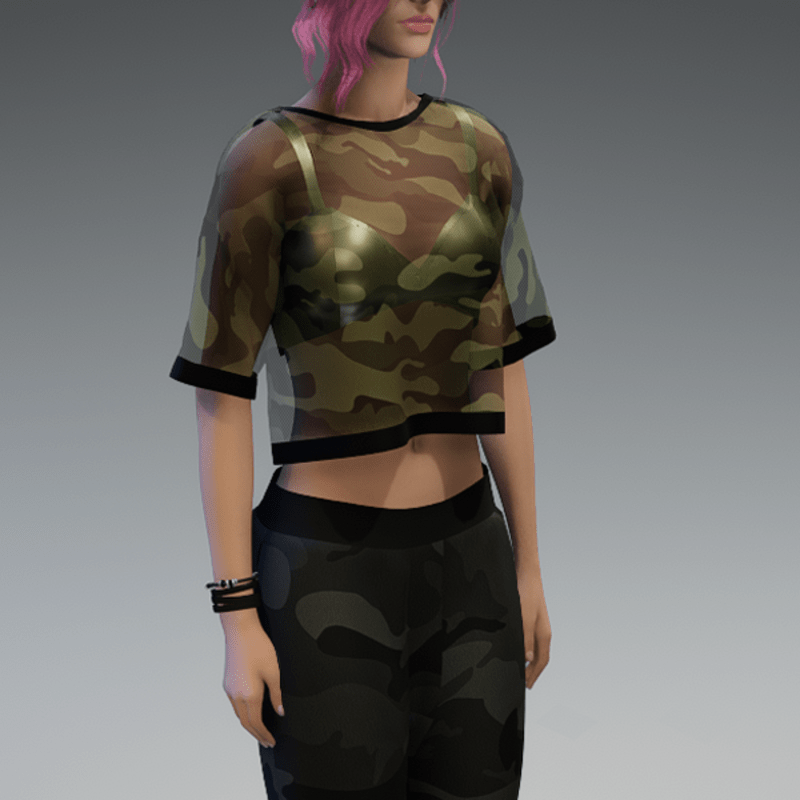 This shirt comes with a dark green and transparent camouflage fabric and a pearl bikini top under it. If you're not sure about how this one will look like on your avatar, feel free to use my 'siggys store' version first before buying this one. If you're interested in the camouflage sweatpants - you can find it in my store, too! Enjoy!