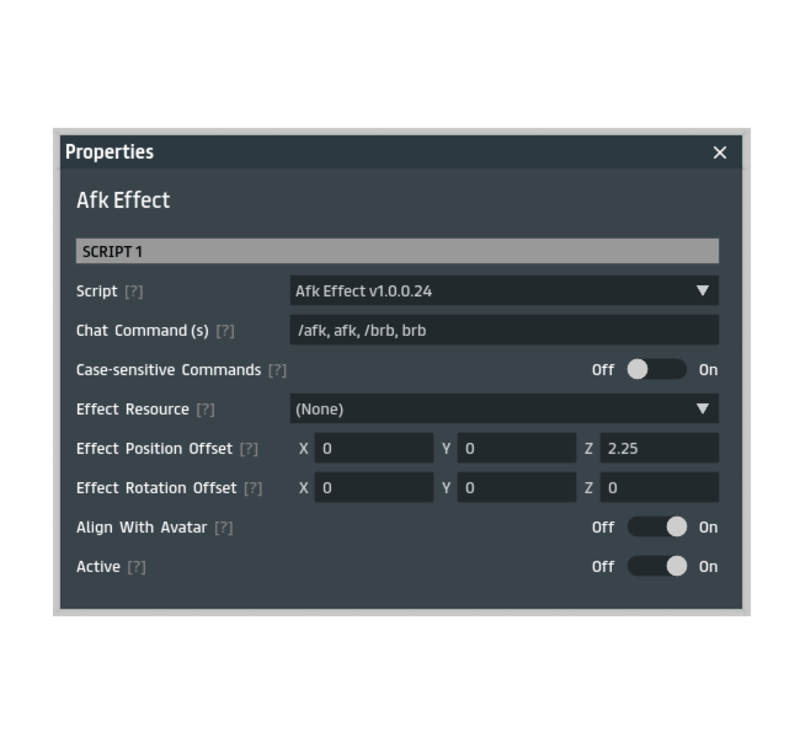 Spawn a custom effect when someone goes away from keyboard, the effect will dissapear automatically when they return. __________________________________________________________________________________________ * Instructions * Drop this script in any object in your experience and select an object from your inventory to use as the afk effect. Change the settings to fit your needs. * Settings * - Chat Command(s): the comma seperated list of chat commands that will trigger the status effect. - Case-sensitive Commands: whether uppercase and lowercase text in chat commands is treated as distinct or equivalent. - Effect Resource: the (animated) object to spawn when a user types one of the chat commands, the object will dissapear again automatically. - Effect Position Offset: the relative spawn position offset from the avatar. - Effect Rotation Offset: the initial rotation offset in degrees. - Align With Avatar: The rotation offset is applied relative to the avatar rotation when on, and the rotation will be absolute in world space when off. - Active: toggles the script on or off. * Questions, issues or suggestions? * Contact @Tron-Sansar