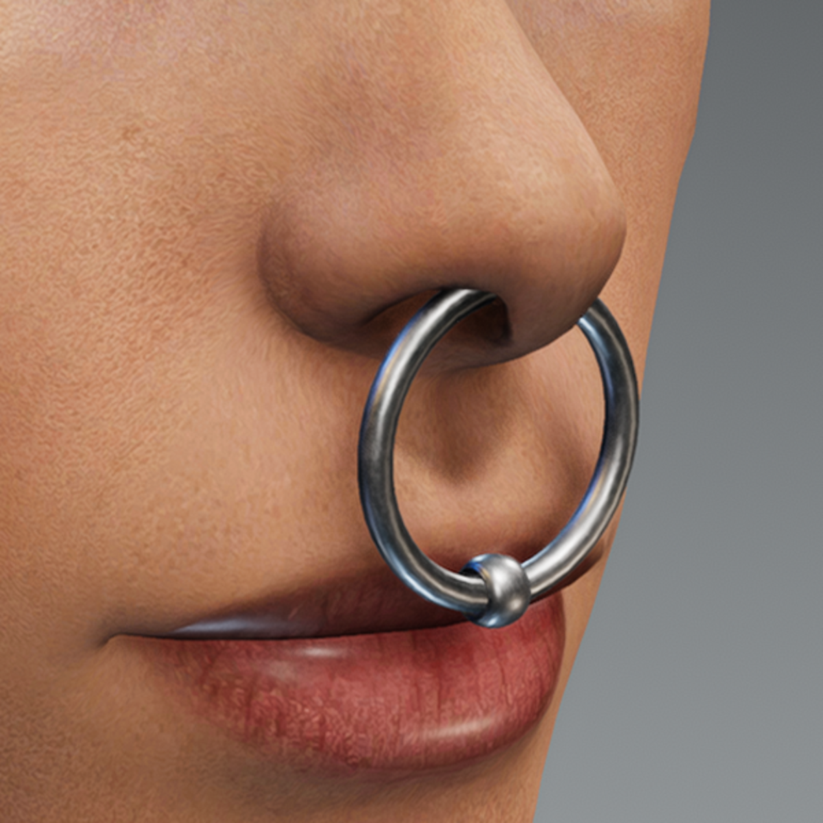 Nose Ring Piercing Medium Silver PBR material and paced at the Glasses slot. If you like the skin texture and avatar you can get it for free from my shop link see: https://store.sansar.com/listings/e37a63c6-b6f5-4705-83f0-8e321930434b/avatar-20-compatible-female-4k-photo-based-with-underwear-in-texture