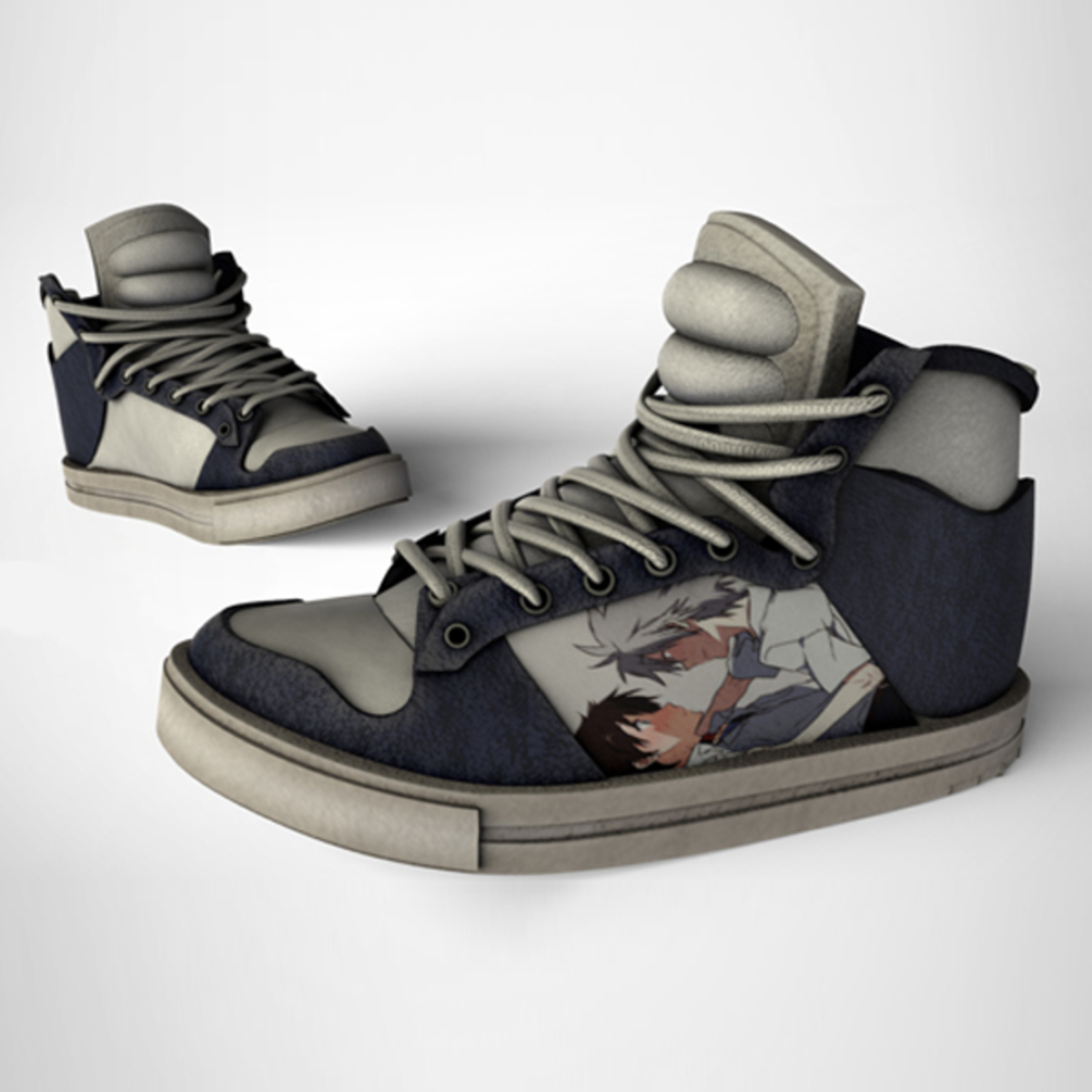 A white and dark blue high-top sneaker for males. Shoes has a graphic of anime character.