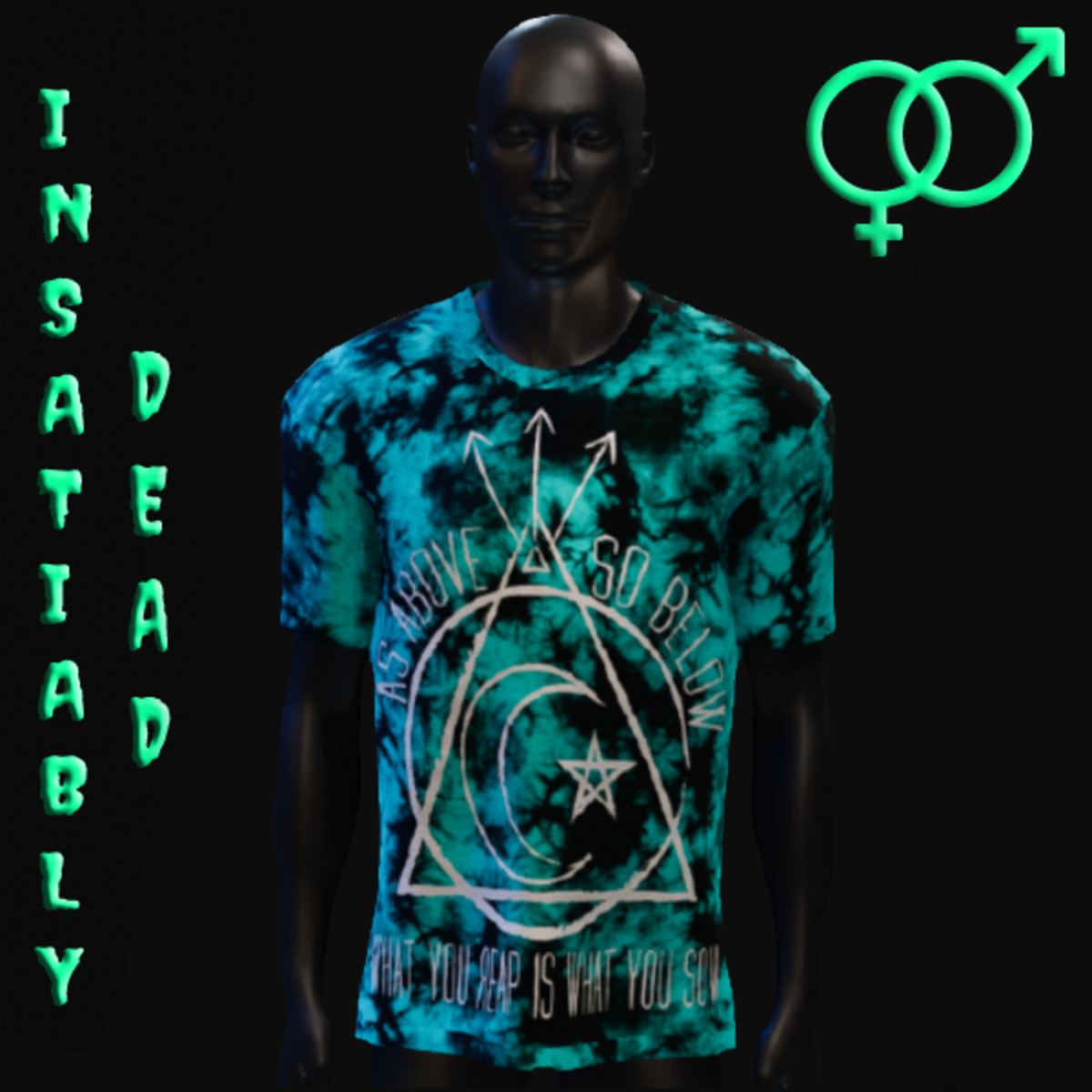 FOR ALL THE GHOULS AND GALS. UNISEX "AS ABOVE SO BELOW" T-SHIRT DARK TIE DYE [BLACK/AQUA]. CREATED IN MARVELOUS DESIGNER WITH AVATAR 2.0. ADJUSTMENT MAY BE REQUIRED! FITTING INSTRUCTIONS CAN BE FOUND BY GOING TO THE LINK BELOW. https://help.sansar.com/hc/en-us/articles/115005693363-Fitting-Marvelous-Designer-clothing-to-your-avatar PLEASE RATE AFTER BUYING! IF ANY ISSUES OCCUR PLEASE CONTACT TEAGAN BROKKEN FOR ASSISTANCE. THANK YOU! <3 <3 GET INSATIABLY DEAD <3