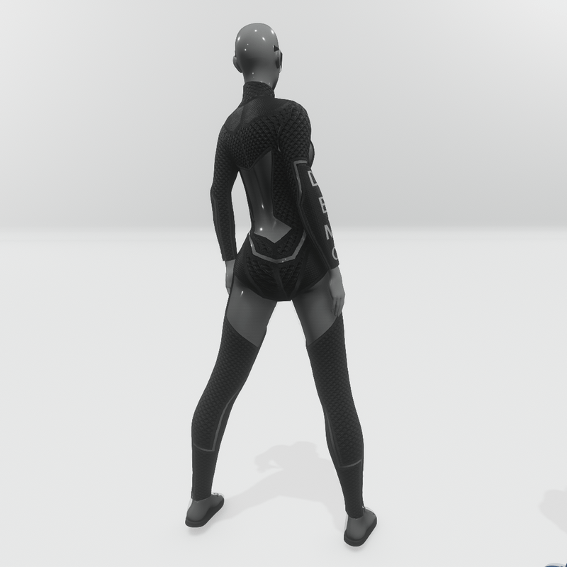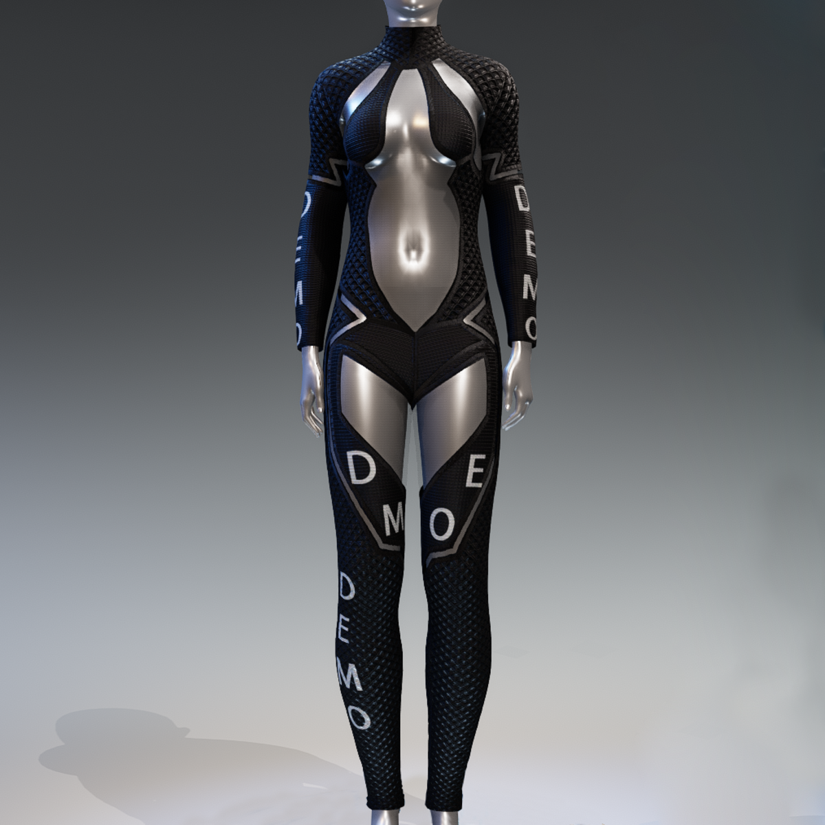 Futuristic female jumpsuit, with large, plastic like, high transparent areas. It has long sleeves and mock turtleneck. Free demo item