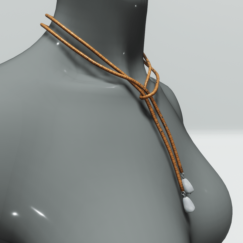 A slip on necklace in orange colour with two irregular shape pearls at the end of each strand and silver details.