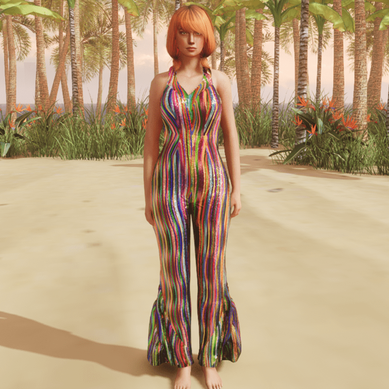 Seventies Jumpsuit, colorful stripes, glittering. The flares are created to the sides, so you can dance after simulating without sticking together.