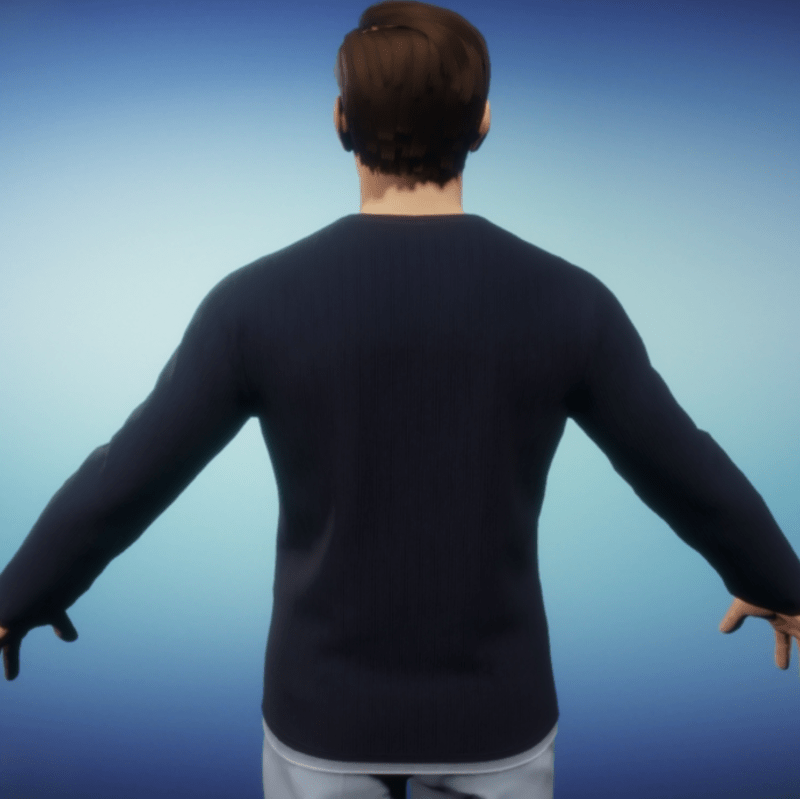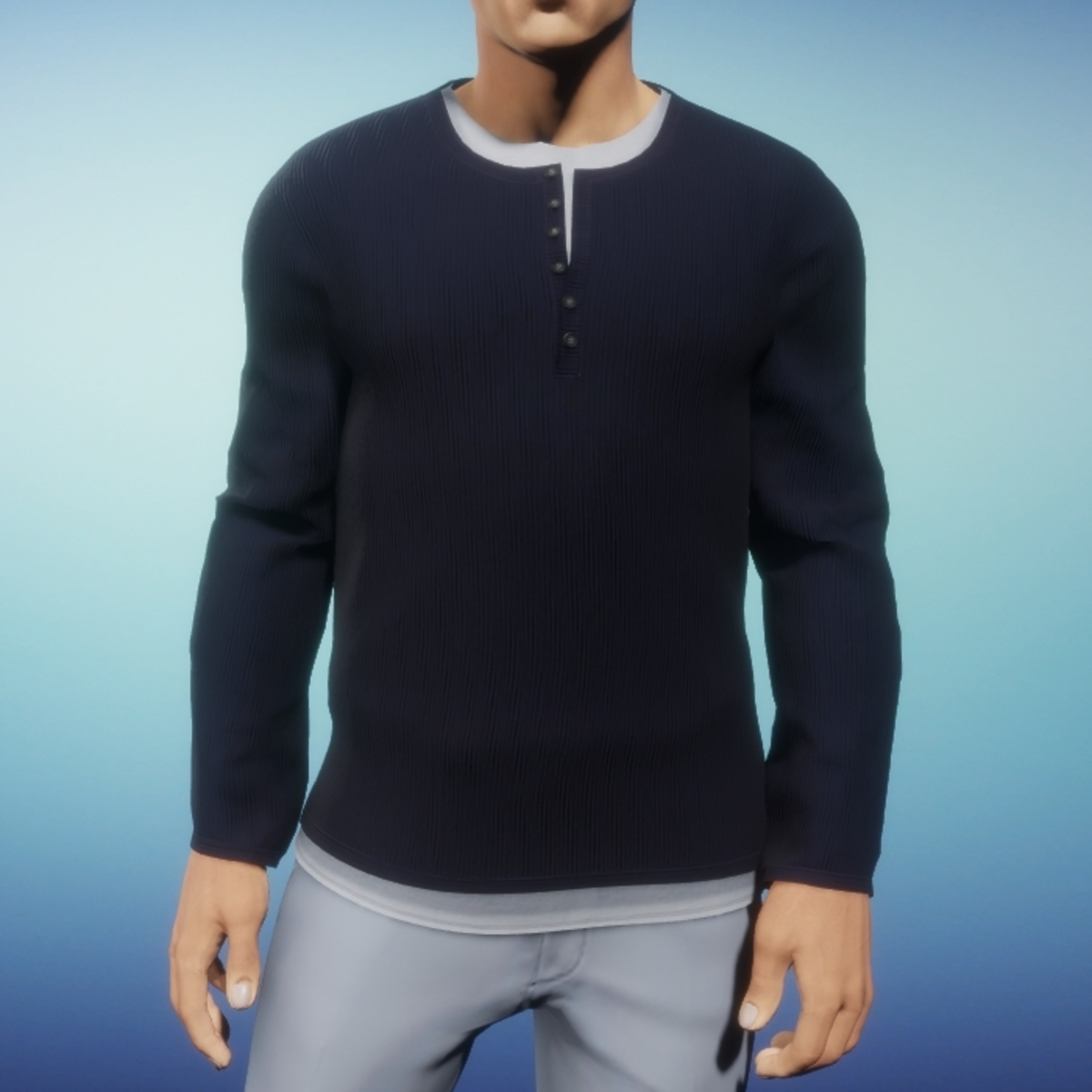 Men's Henley style shirt with white undershirt. Undershirt shows at neckline and hemline. Shirt has button placket closure that is partially buttoned. Please note that while in lookbook you will might see a little bit of skin poking out in the underarm area; however, once you have saved your look and Sansar has completed the process of baking your avatar the skin will not show in Sansar. Please be sure to hit the simulate button in the lookbook when wearing any clothing made in Marvelous Designer. This much improves the fit as well as gives you the chance to push the fabric around to your liking. It is advised to not wear hair until you have completed the simulate process.