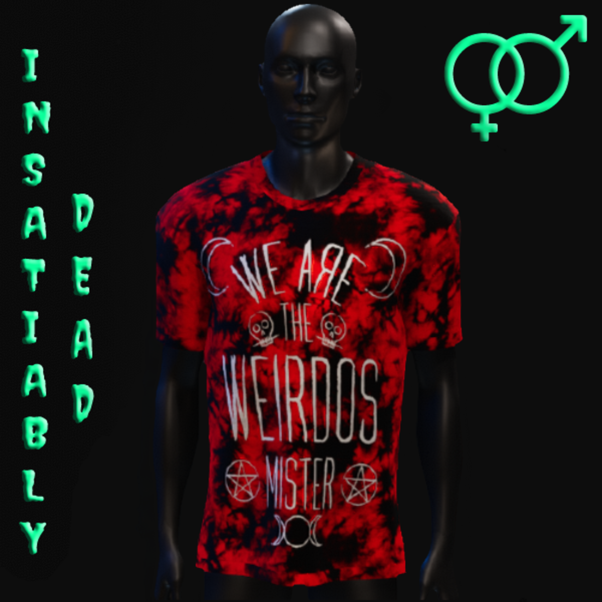 FOR ALL THE GHOULS AND GALS. UNISEX "WE ARE THE WEIRDOS MISTER" T-SHIRT DARK TIE DYE [BLACK/RED]. CREATED IN MARVELOUS DESIGNER WITH AVATAR 2.0. ADJUSTMENT MAY BE REQUIRED! FITTING INSTRUCTIONS CAN BE FOUND BY GOING TO THE LINK BELOW. https://help.sansar.com/hc/en-us/articles/115005693363-Fitting-Marvelous-Designer-clothing-to-your-avatar PLEASE RATE AFTER BUYING! IF ANY ISSUES OCCUR PLEASE CONTACT TEAGAN BROKKEN FOR ASSISTANCE. THANK YOU! <3 <3 GET INSATIABLY DEAD <3