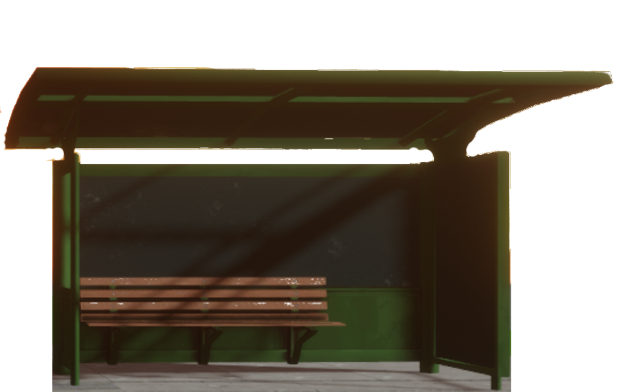 Bus Stop, I'm not sure of the default dimensions. The sidewalk base shown is not part of the item; I suck at Gimp.