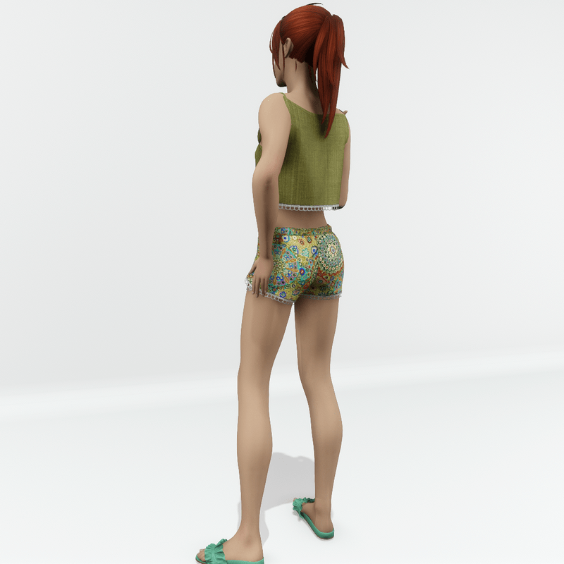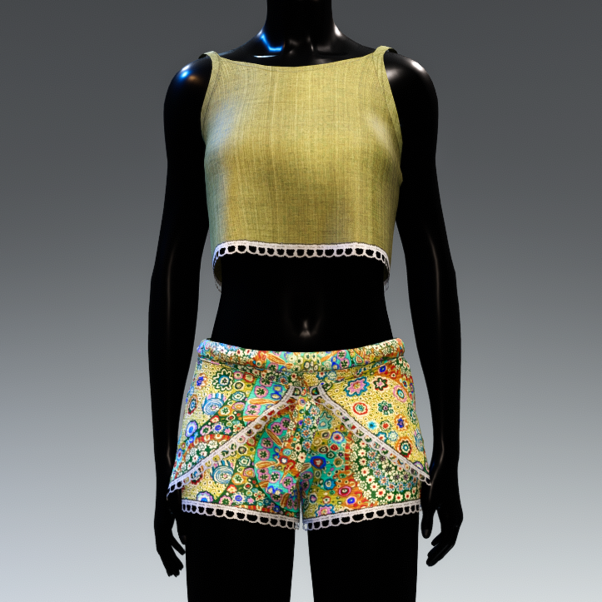 A beautiful cute, casual summer set in yellow colour. The shorts is made with multicoloured bohemian fabric and has a double front side. The strap top is short and plain colour. Both are decorated with a white lace trim.