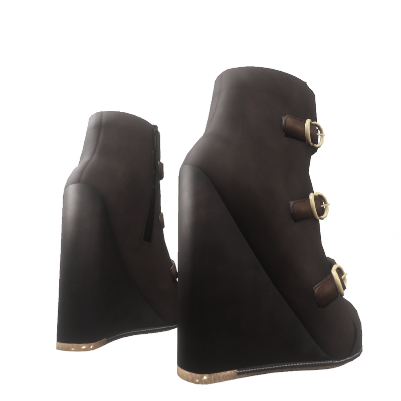 Wedge high heel ankle boots with buckled straps and zipper. Suitable for for "Alina Daisy" and "Nicci" avatar. In dark brown colour. Get the free demo to check style and fit before purchasing here: https://store.sansar.com/listings/15b263a6-d7be-40a3-9fd0-c0aefbe5e50f/wedge-boots-for-alina-daisy-and-nicci-avatar---demo