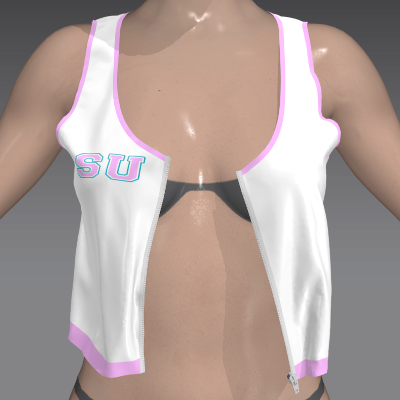 A shiny plastic cheerleader crop top. Working zip, can be worn fastened, unfastened, or in between. Adjustable. 'Space Unicorn' motif on back, 'SU' letters on front. Designed to match my other Cheerleader clothing.
