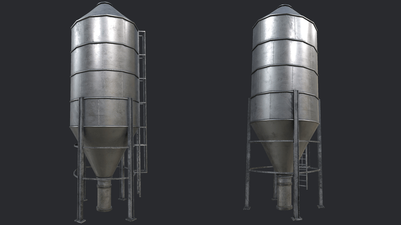 Farm Silo 4 PBR Very Detailed Huge Old Rusty Silo with High-Quality Rusty Steel / Metal PBR Texturing Fits perfect as Decoration in any Exterior landscapes, or as a landmark. The Silo has great details to it, such as old rusty Steel Beams and Legs and Steps. The Mesh is unwrapped, and UV Mapped PBR Painted Albedo, Roughness, Metallic, Normal. 2048x2048 Texture Maps TGA Low Poly Triangles 2962 Polys 1785 Verts