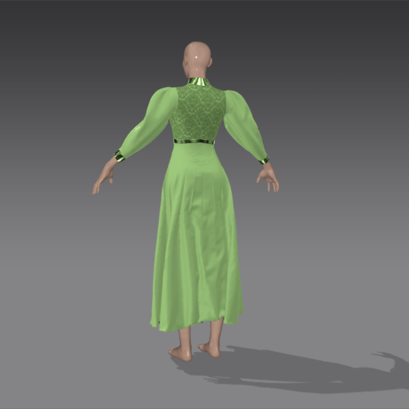 A long, flowing cotton dress cut in the Edwardian style, with lambchop sleeves, high collar and elaborately ornamented bodice. In a luminous pistachio green.