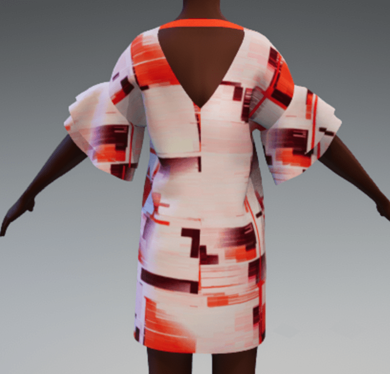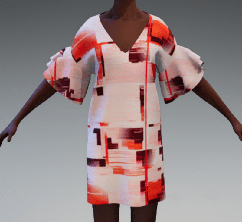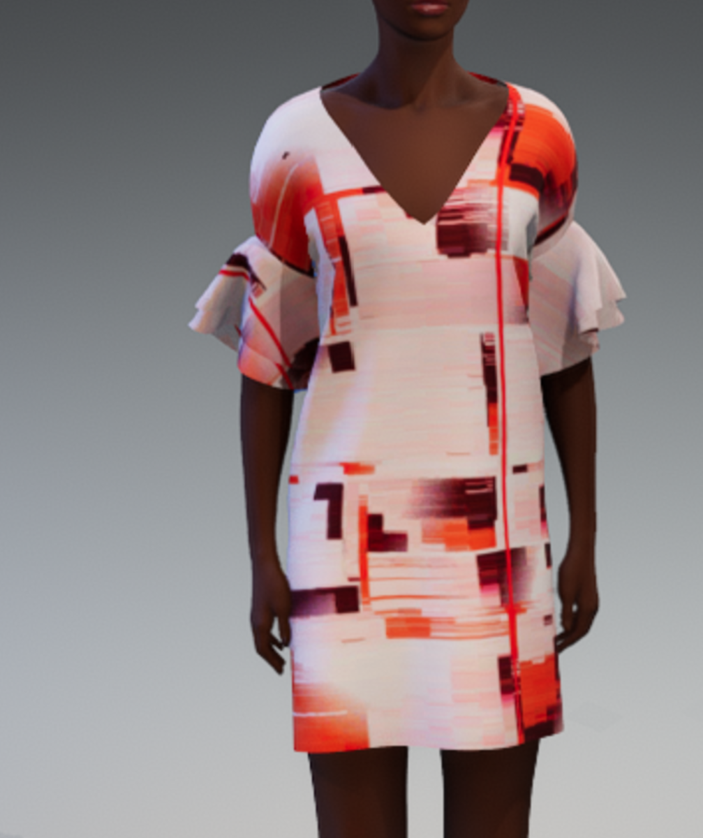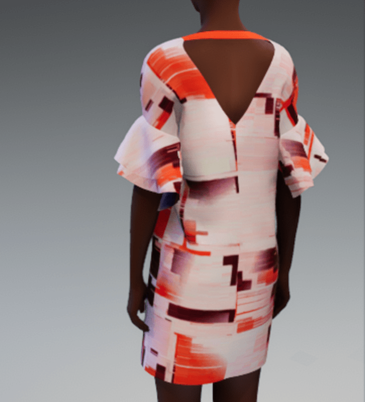 Deep v-neck shift dress with v opening in back with strap. Frill sleeves. Short length. Glitch allover print in shades of reds.