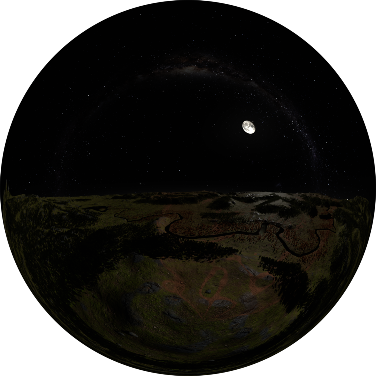 Forests, canyons and a river. Mountains in the distance. POV high rise, mountain top, hot air balloon. The moon in the image is using the CGI kit of materials published by NASA's Scientific Visualization Studio. The sky is The Milky Way Panorama by ESO/S. Brunier.