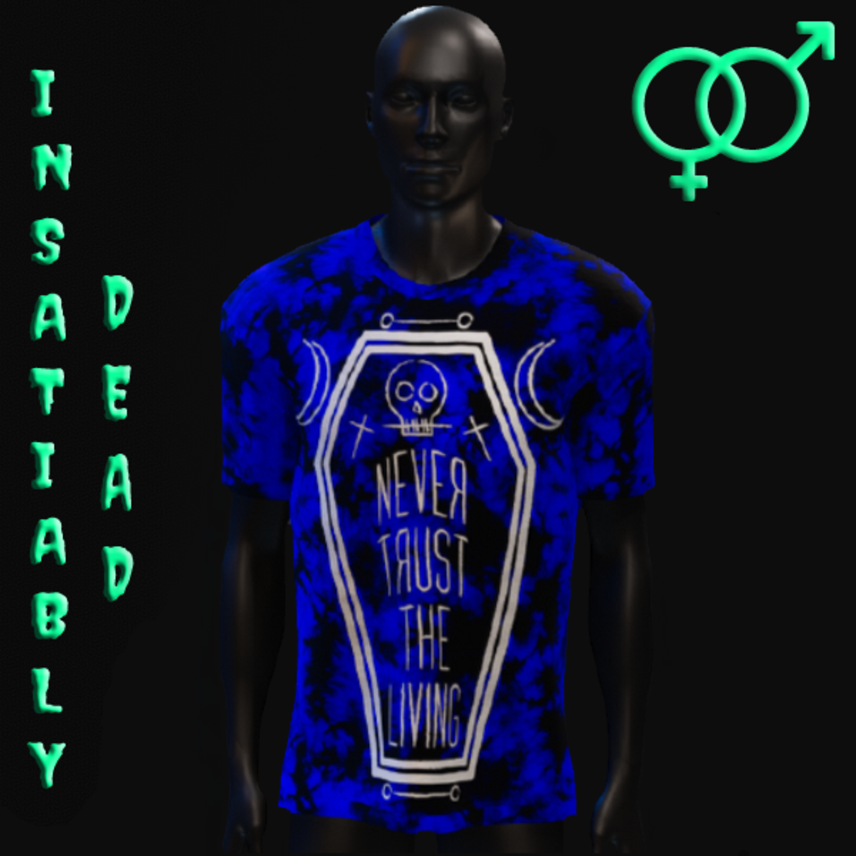 FOR ALL THE GHOULS AND GALS. UNISEX "NEVER TRUST THE LIVING" T-SHIRT DARK TIE DYE [BLACK/BLUE]. CREATED IN MARVELOUS DESIGNER WITH AVATAR 2.0. ADJUSTMENT MAY BE REQUIRED! FITTING INSTRUCTIONS CAN BE FOUND BY GOING TO THE LINK BELOW. https://help.sansar.com/hc/en-us/articles/115005693363-Fitting-Marvelous-Designer-clothing-to-your-avatar PLEASE RATE AFTER BUYING! IF ANY ISSUES OCCUR PLEASE CONTACT TEAGAN BROKKEN FOR ASSISTANCE. THANK YOU! <3 <3 GET INSATIABLY DEAD <3