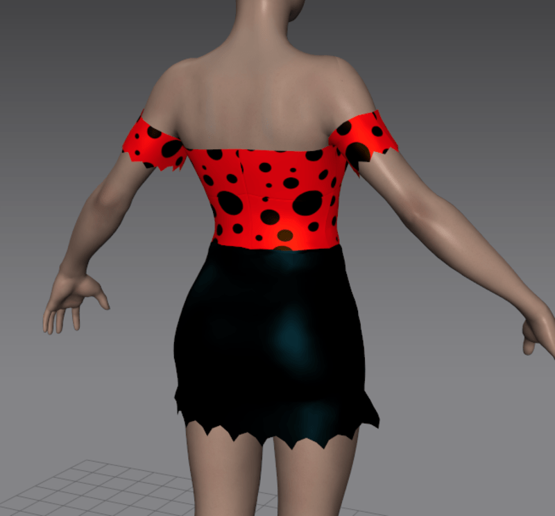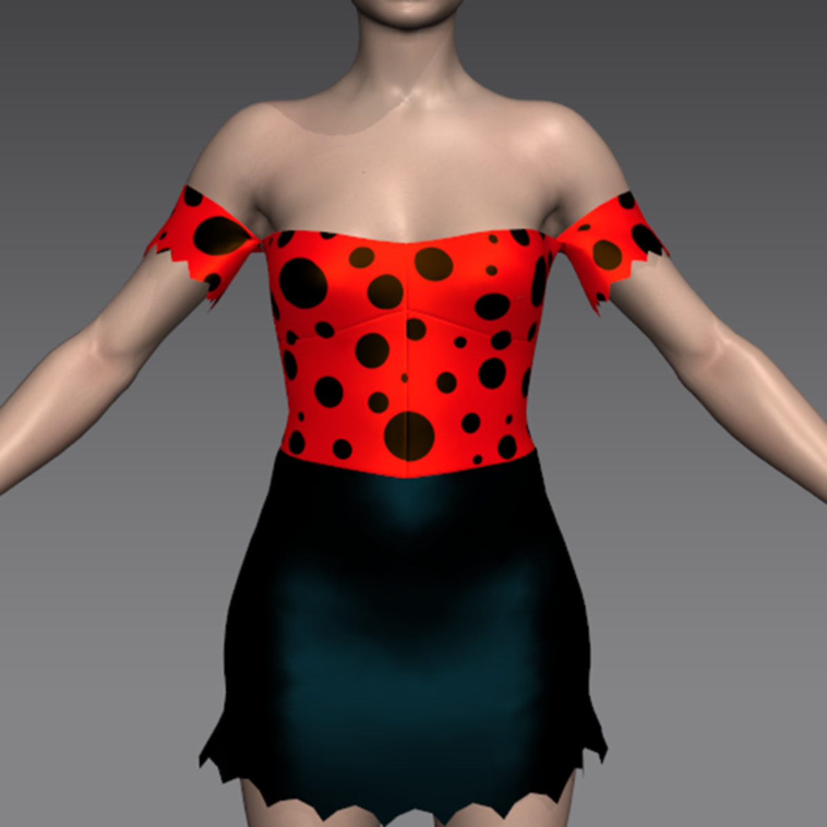 Daisy Mae Yoakum, from the LI'L ABNER comics, is everybody's favorite hillbilly girl. She keeps things homespun and simple: a strapless top with sweetheart decolletage and tiny sleevelets, in her unique red and black spot print. A skintight micro-mini skirt in glossy black with ragged hemline.