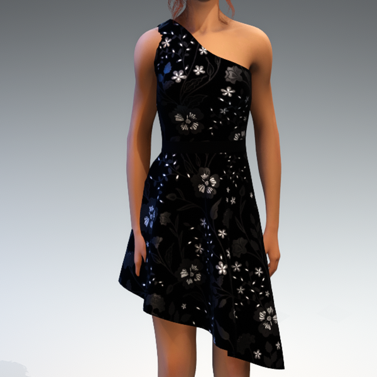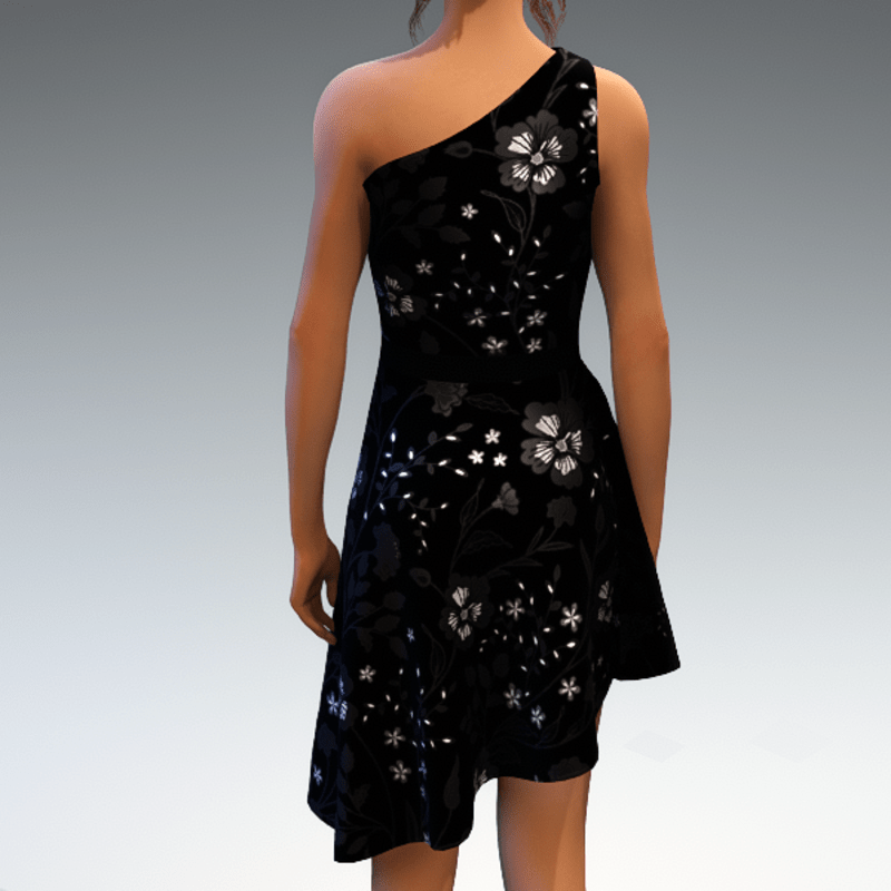 Asymmetric cocktail dress with a shiny floral print. By Sweet Distractions